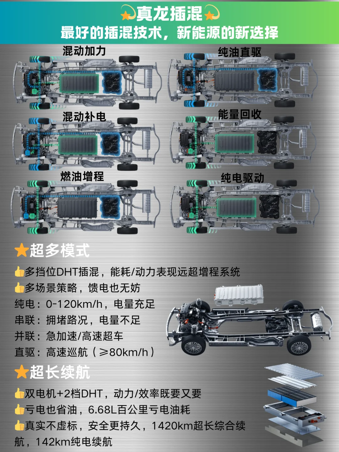✅ 超多模式:纯电、串联、并联、直驱智能切换,堵车省电、高速省油,彻底告别续航焦虑。
