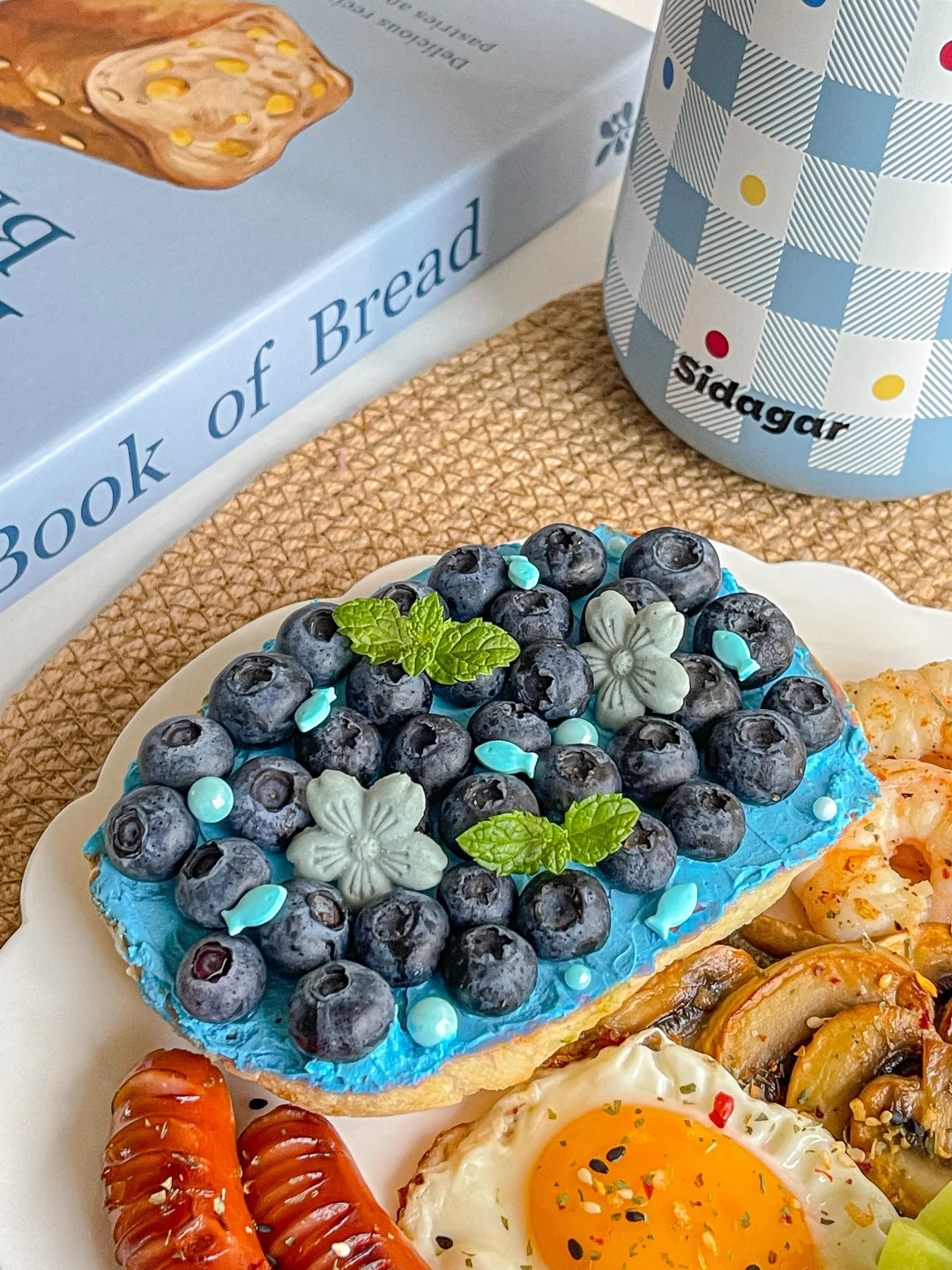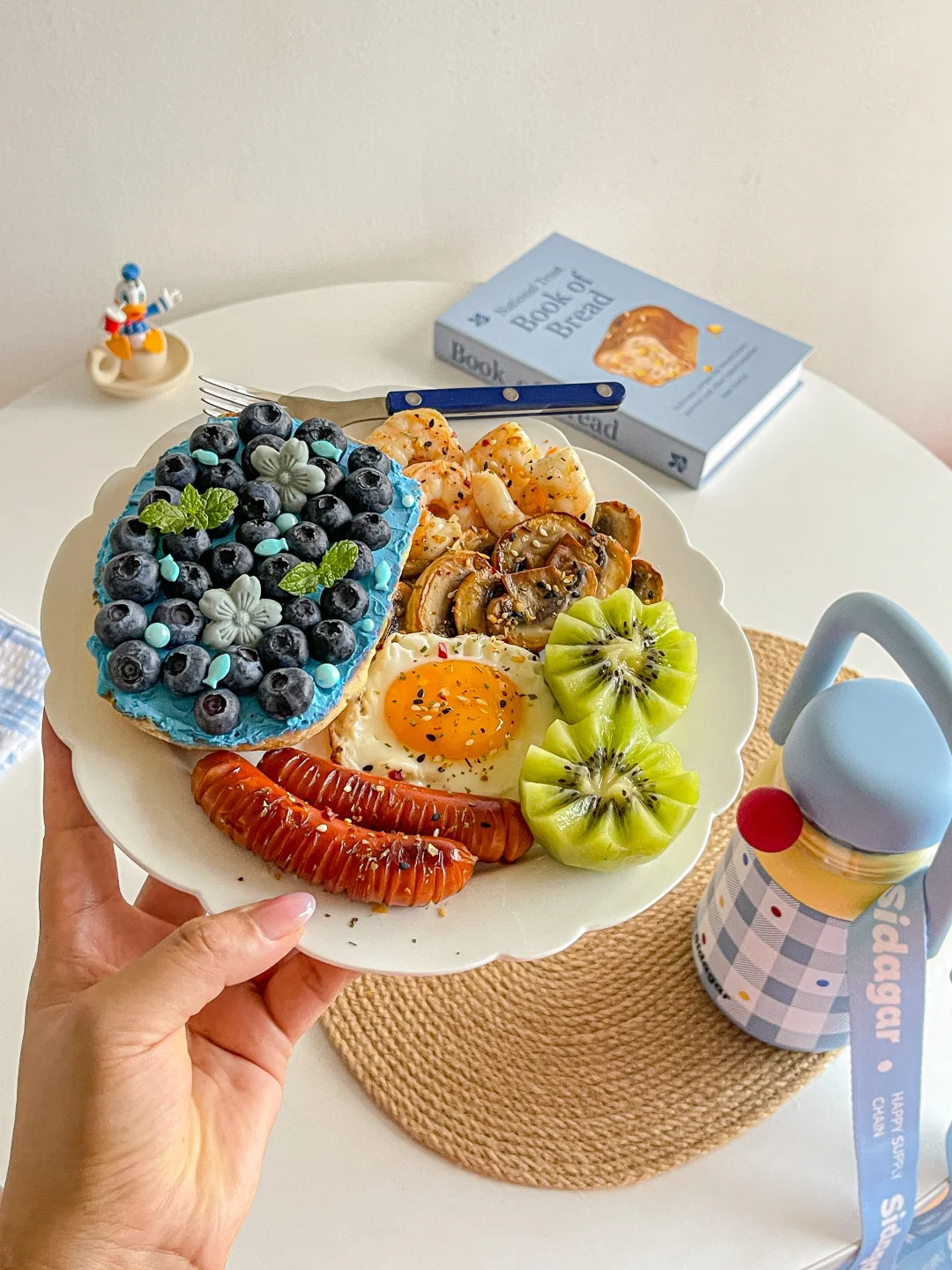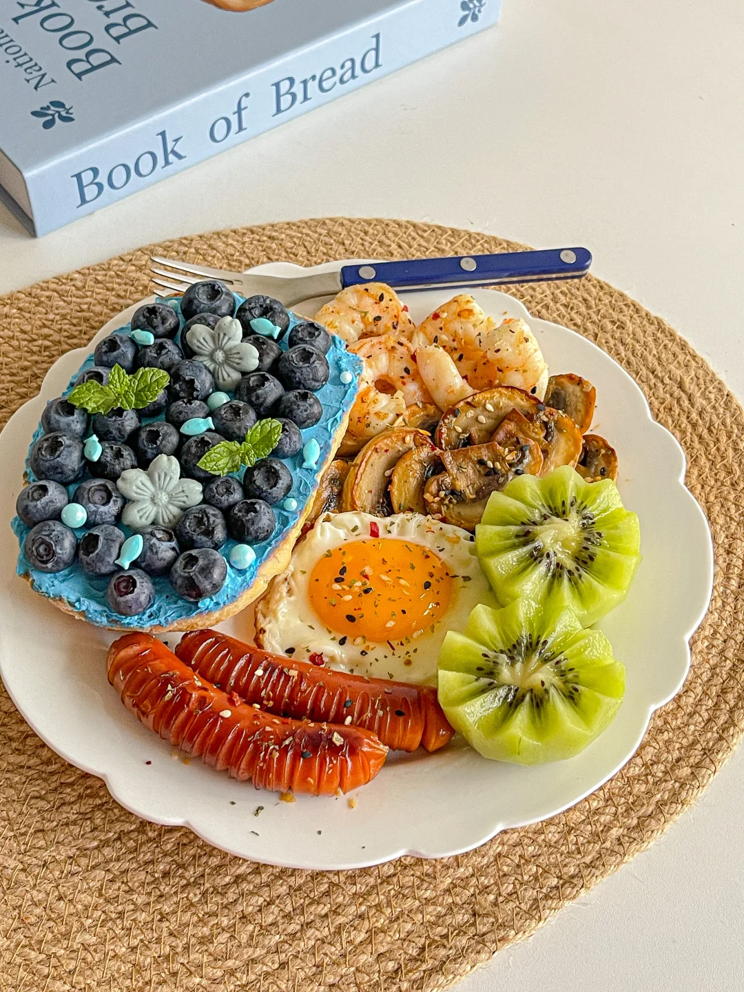 蓝色也可以hin有食欲!🥣 恰巴塔和希腊酸奶蓝莓的搭配真妙~ 🥖今日食材: 恰巴塔➕藻蓝蛋白粉➕希腊酸奶➕蓝莓➕饼干➕烤肠➕鸡蛋➕奇异果➕口蘑➕虾仁 漂亮的人吃漂亮饭~蓝色系的早餐美味且治愈!满满当当的一盘端 咸甜永动机!