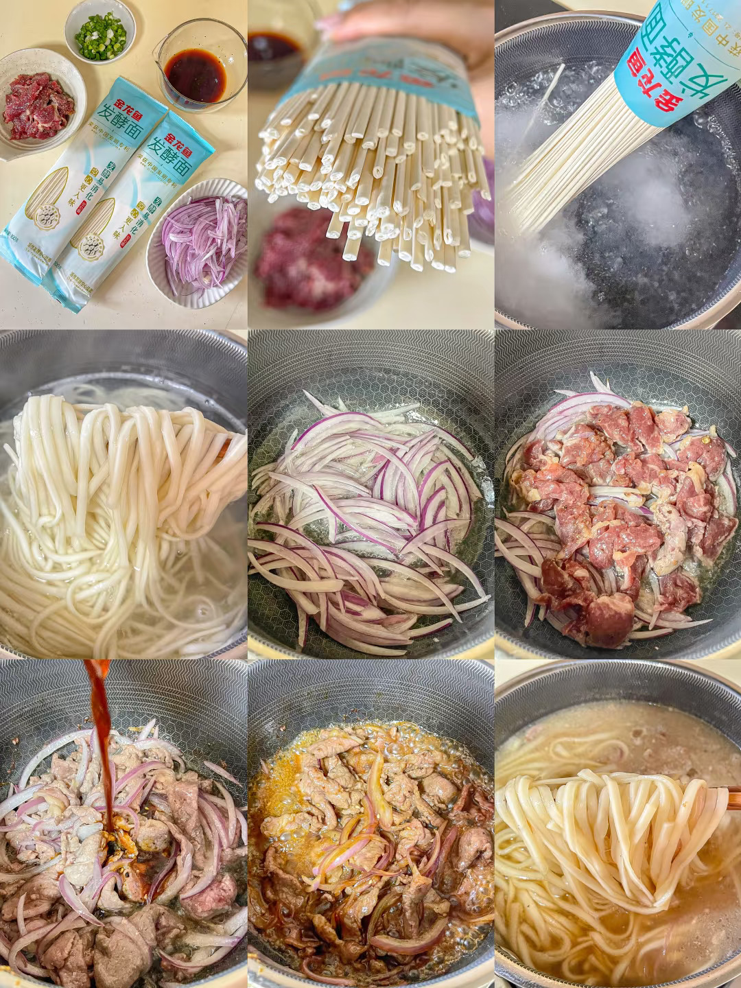 2.挂面放入沸水中煮熟捞出备用 洋葱炒出香味后放入腌制好的牛肉 翻炒均匀 倒入酱汁