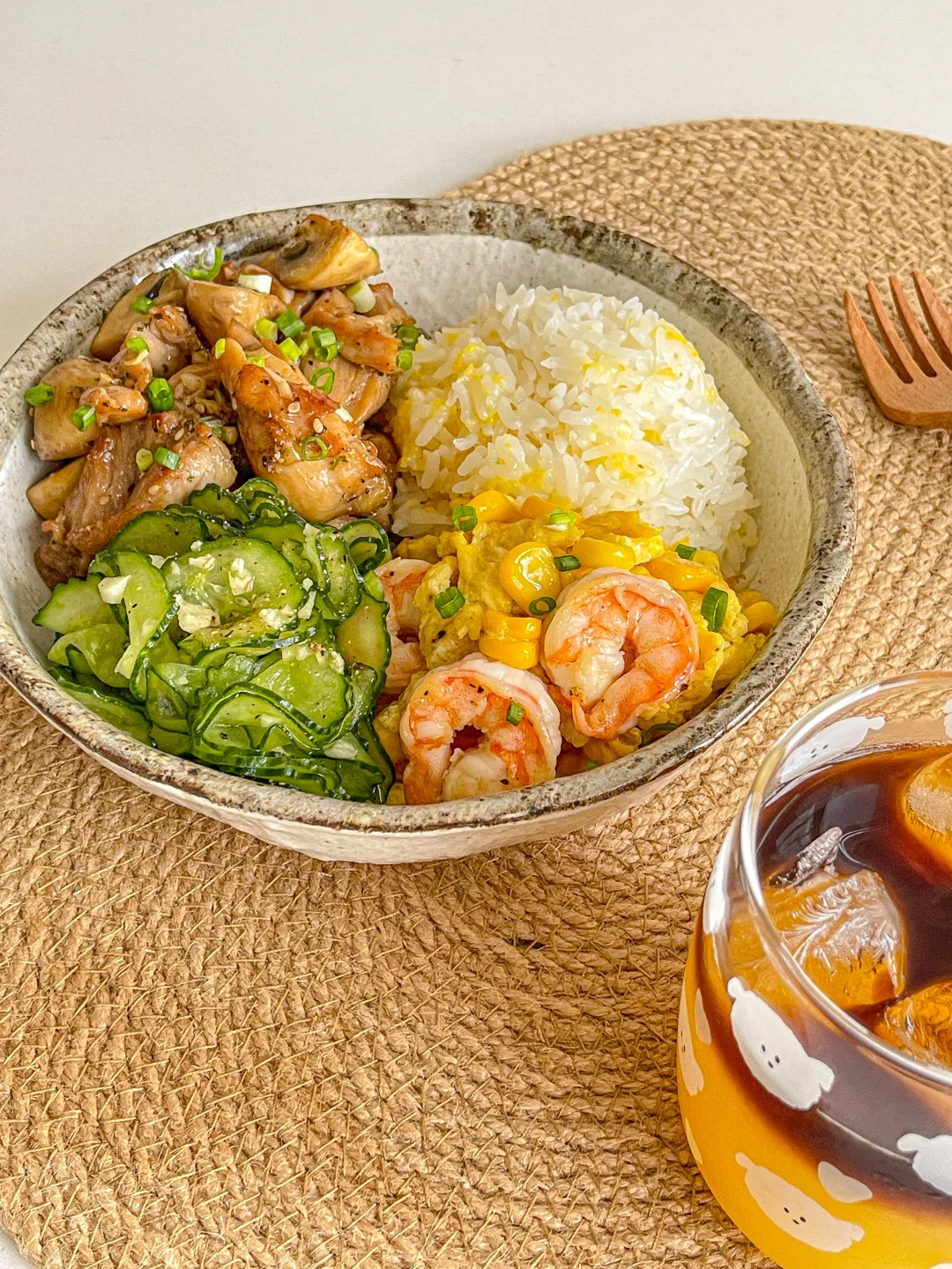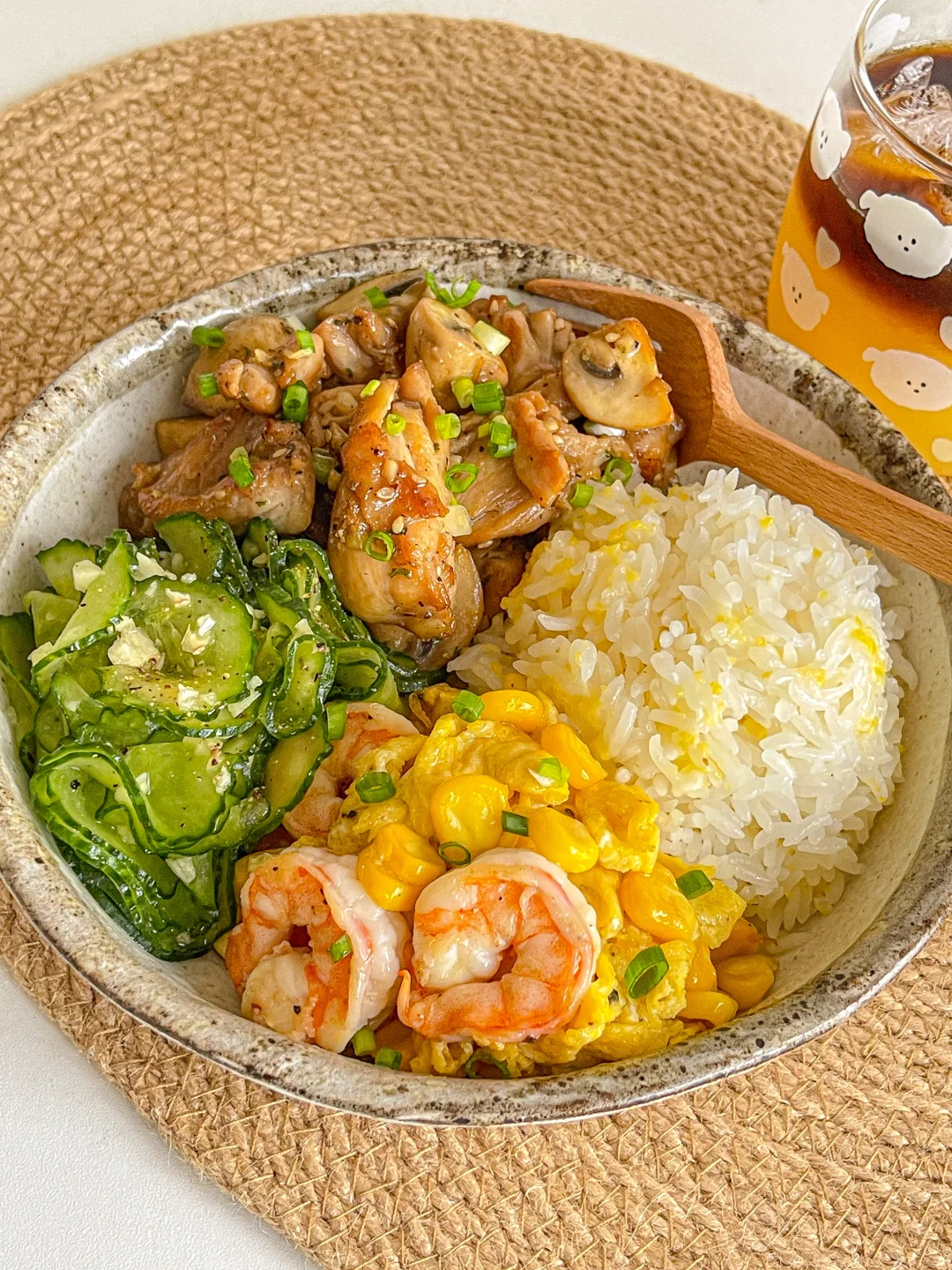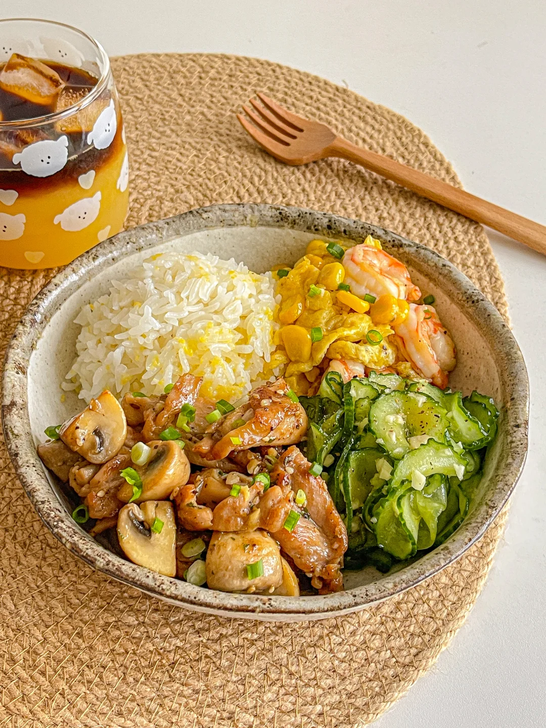 又吃美了!干净舒服的饭菜得我心!❤ 今日菜单:🍲 口蘑炒鸡腿肉 虾仁玉米滑蛋 盐渍黄瓜 饮品是老演员橙汁➕意式浓缩!搭配饭菜清爽解腻!