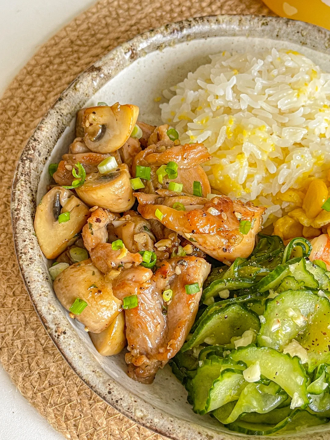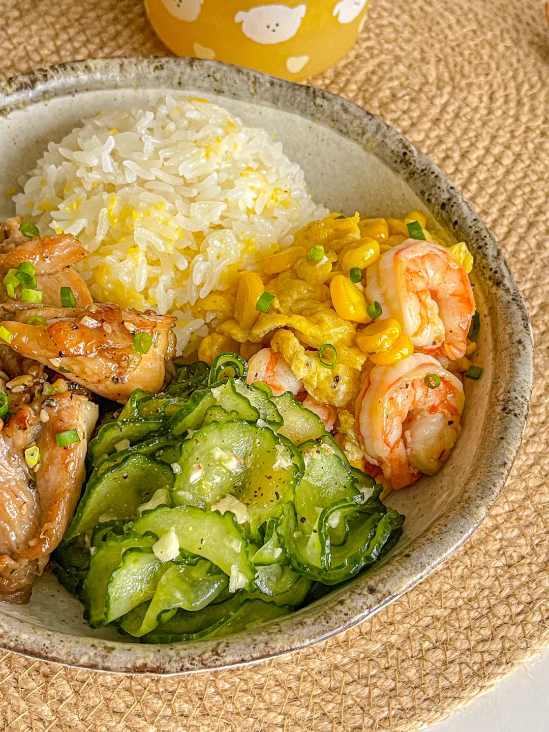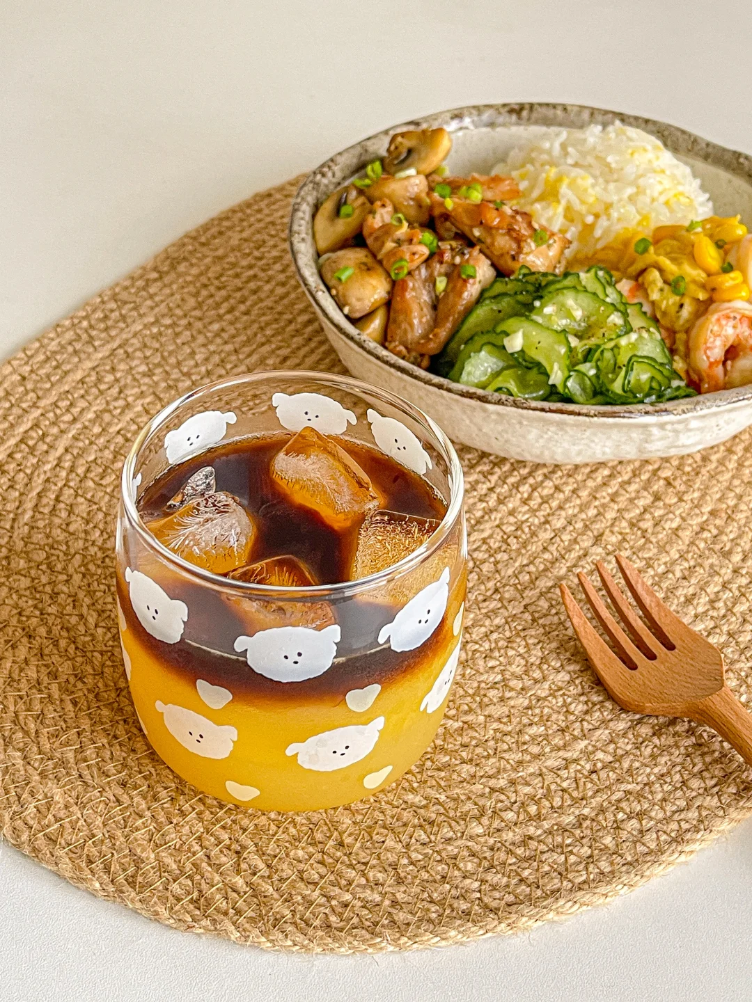 又吃美了!干净舒服的饭菜得我心!❤ 今日菜单:🍲 口蘑炒鸡腿肉 虾仁玉米滑蛋 盐渍黄瓜 饮品是老演员橙汁➕意式浓缩!搭配饭菜清爽解腻!