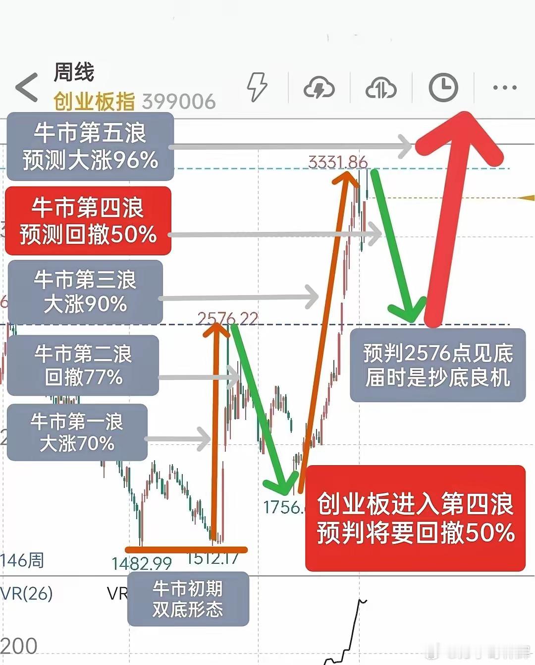牛市走到了第四浪,大回调要来了,大家注意防守。预判创业板将回调到2576点,回撤50%,届时是抄底的大机会