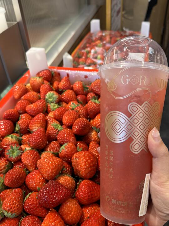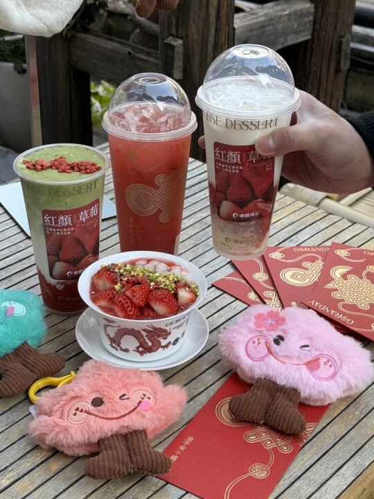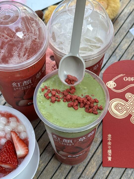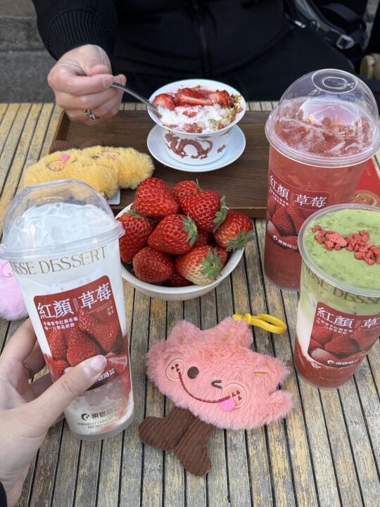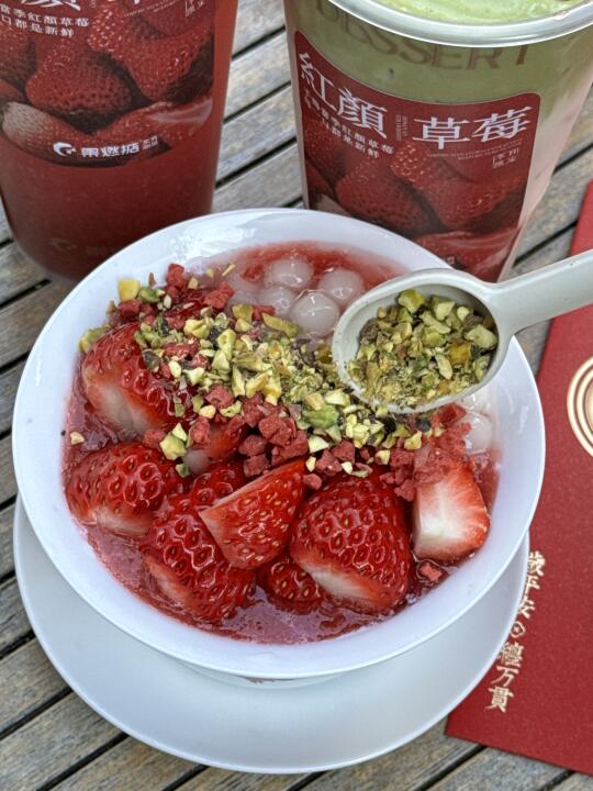 草莓脑袋都去给我喝!真的爆好喝! 制作台旁边就是整盒的大颗奶油草莓🍓 每一杯都好好喝,满满草莓果肉😭 草莓大福西米露、18 颗手摏莓莓这两杯我真的超爱,浓郁果香 还有莓莓双皮奶,duangduang的奶香十足,里面的糯米小圆子我真的超爱