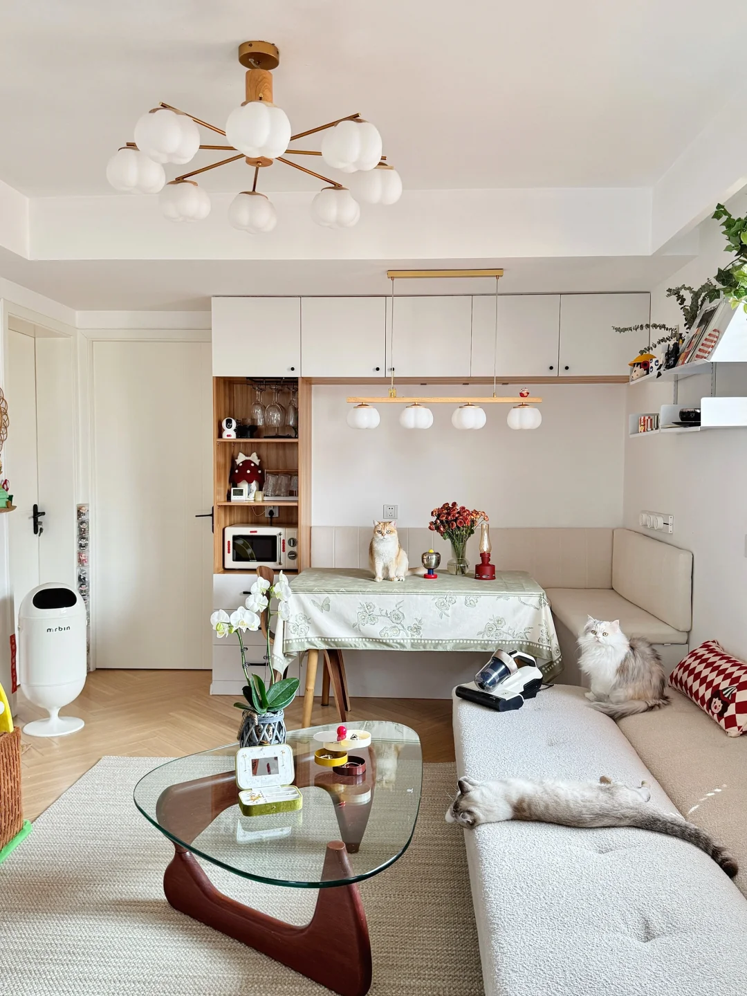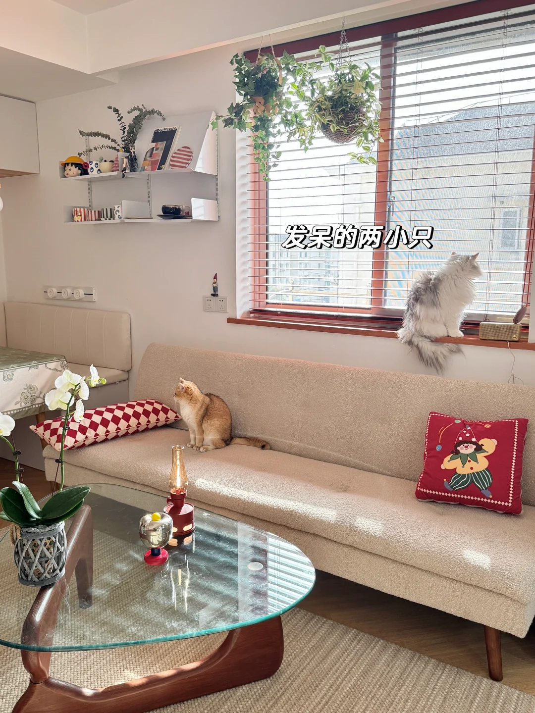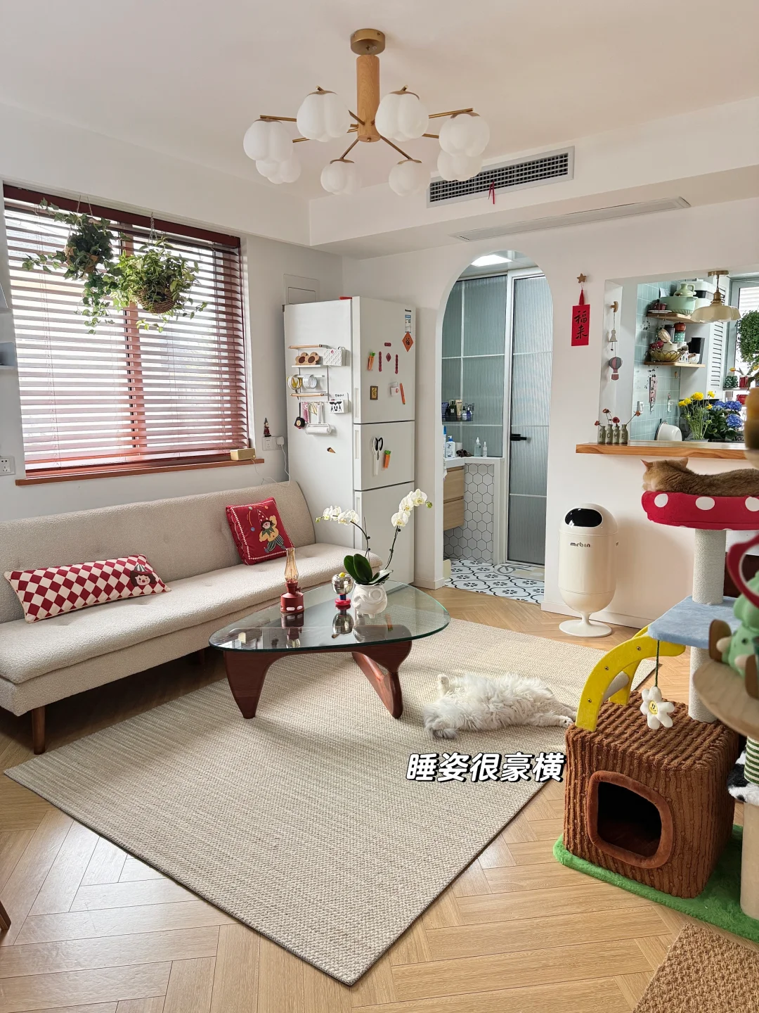 📍坐标上海 📌建面65平,台内51平 ✨两室一厅,一厨一卫,2人3猫 ✨客厅开间4.5*3.3m ✨沙发长2.2m,地毯1.6*2.4m