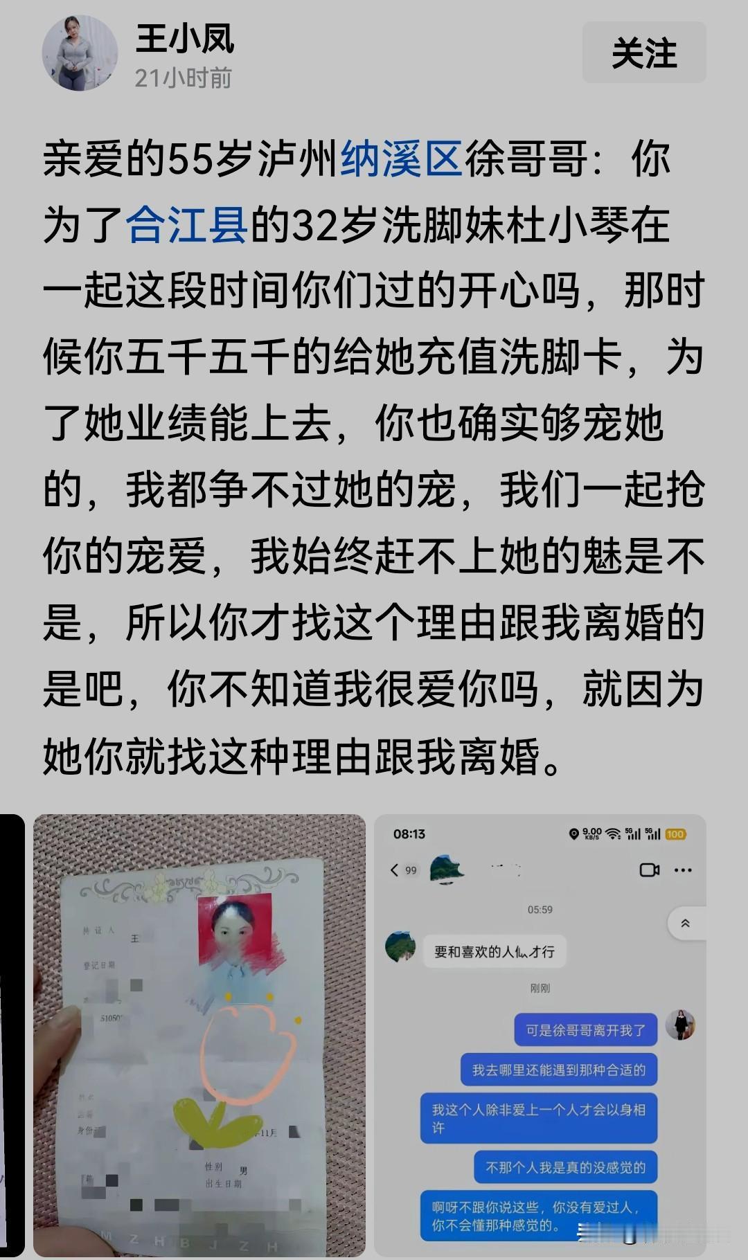 这个离婚理由太奇葩!必须圈起来——要考。 自从有了网络,网友们在网上什么话都敢说。这不,大早上刷到一位 女网友发的头条,她写了一封公开信,要给55岁的泸州纳溪区亲爱的前夫徐哥哥。她不放心的问前夫徐哥哥:你与合江县32岁的洗脚妹杜小琴在一起这段时间过的开心吗?那时候你为了她的业绩,五千五千的给她充值洗脚卡,不得不说确实够宠她的,最终我没有争过…… 看了这位网友给前夫徐哥哥的信,网友们并没有感到有什么特别的。现在的社会人们的思想比较解放,年轻人可以从校服到婚纱,她前夫徐哥哥的二婚当然也能源于洗脚。 不过,看到这位女网友晒出来的离婚协议,其离婚理由太奇葩!回头又到这位网友的个人主页看了看,如果主页展示的相片是其本人,这位女网友长相还是蛮不错的,其前夫徐哥哥怎么舍得呢?对她的前夫徐哥哥找出来了离婚理由,网友们能说什么?只能说:这方面可能是天生的,会的想改改不了,不会的想学学不会。