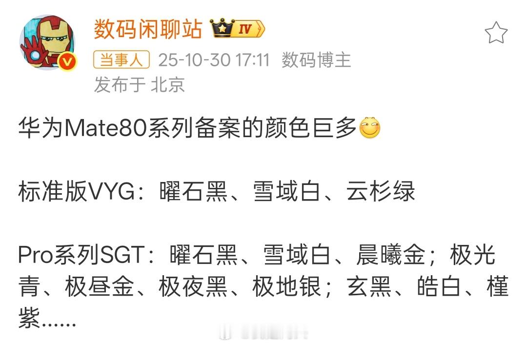 华为Mate80系列颜色曝光这回华为一口气做了这么多配色这下大家可以任意选择了估