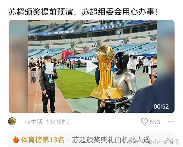 今日19点35分,南京奥体中心体育场,苏超决赛南通队vs泰州队。 江苏城市联赛的冠军奖杯,将被机器人送到比赛的颁奖场地。 这是一场火星撞地球的比赛,谁都想在决赛中把冠军捧回去。 今晚,冠军杯花落谁家?现在还不得而知。 相信两队球迷已浩浩荡荡开进了南京。 有人高兴就有人愁。 一是足球业界人士。他们自视唯有他们正宗,代表中国足球。可是,苏超却不尿他们,自己却把苏超办得比世界杯还红火。 二是足协。一场声势浩大的足球比赛,挂着文旅的牌子,与足协完全没有关系,热闹是他们的,与自己无关,这种落寞心情可想而知。 第三就是南京的球迷了。在自家门口看着两小弟争冠,不用说,心里也不是滋味。 但不管如何,他们在失落中心里还是高兴的,都是自家兄弟,谁夺冠都一样。 至少,他们要比足球界人士,比足协,甚至比南通和泰州的球迷更高兴。 不论是谁胜,都是苏超的骄傲。