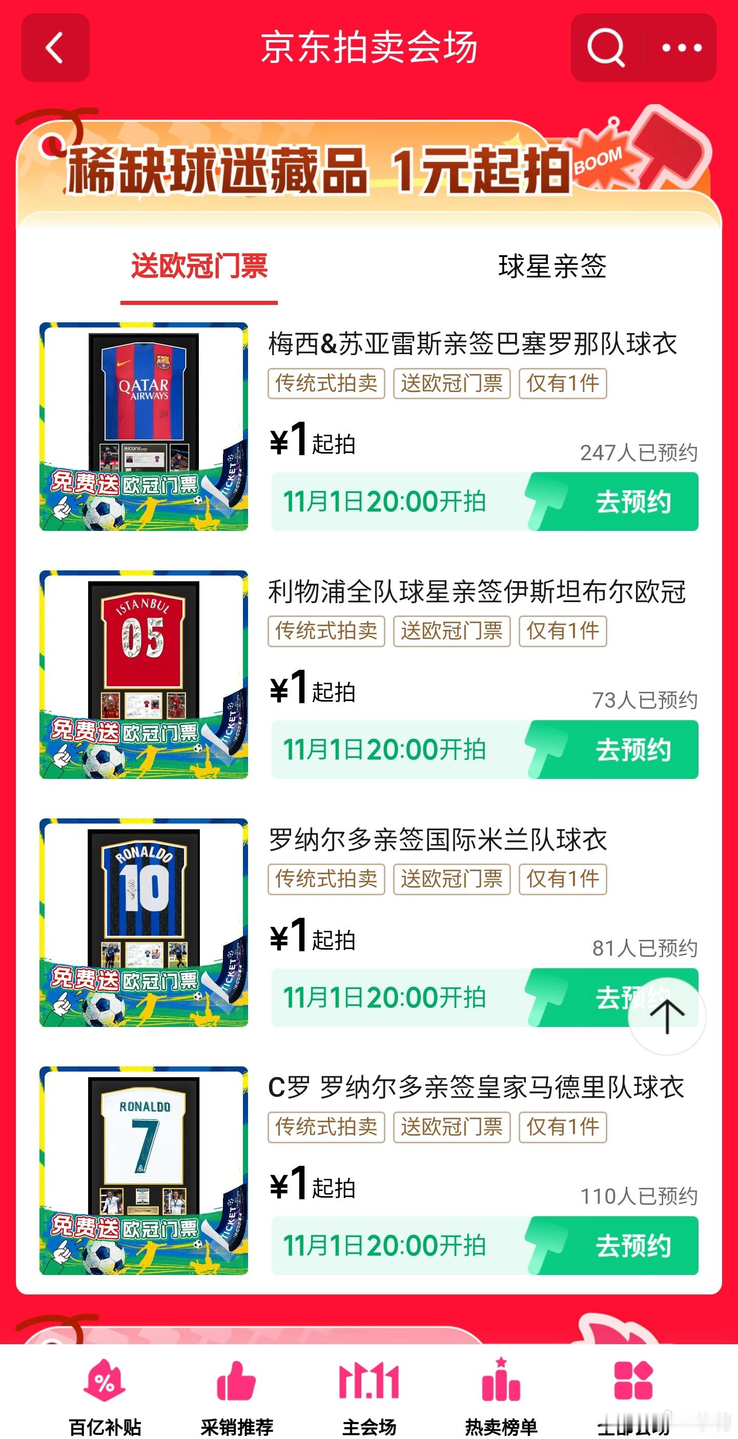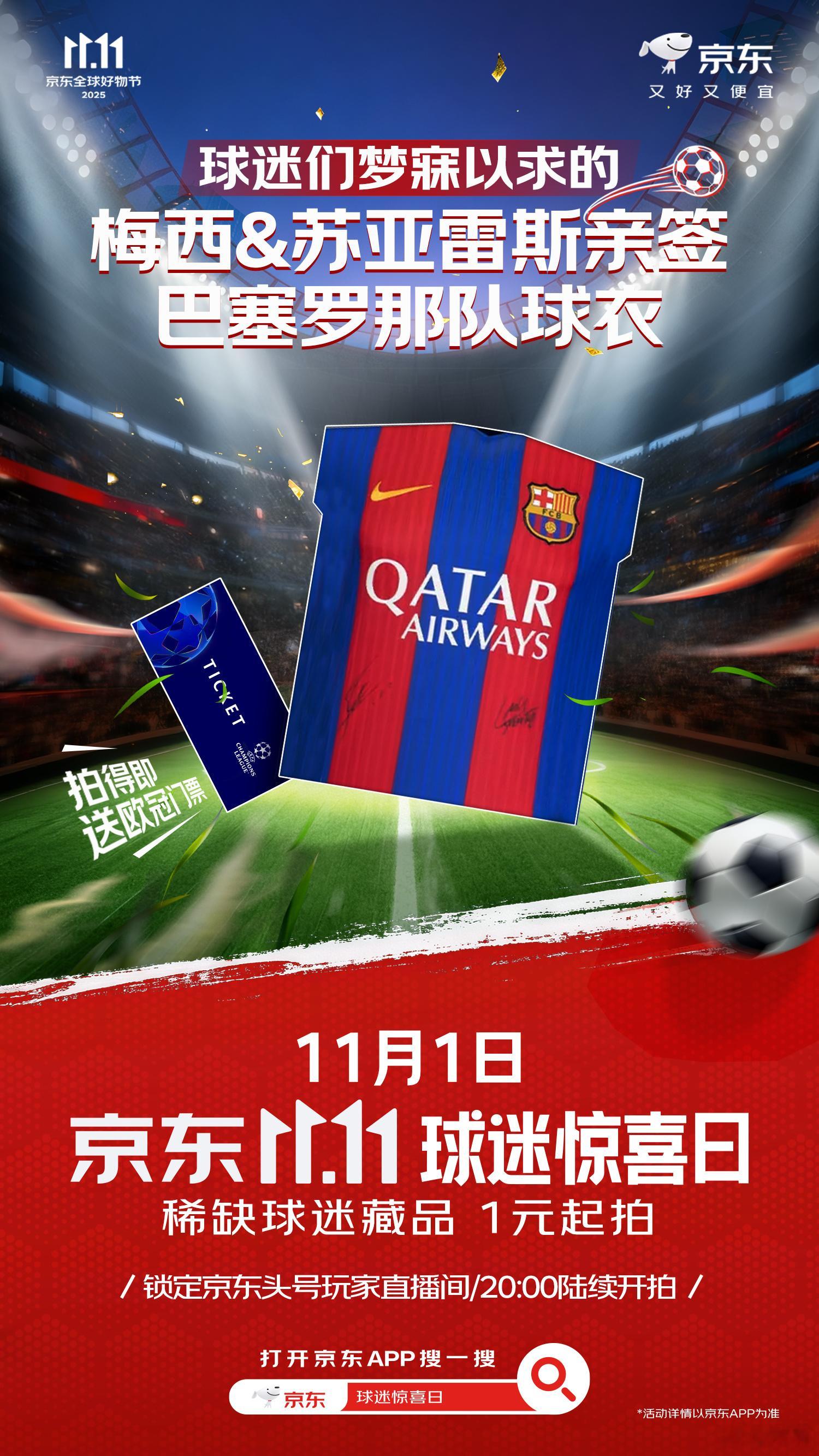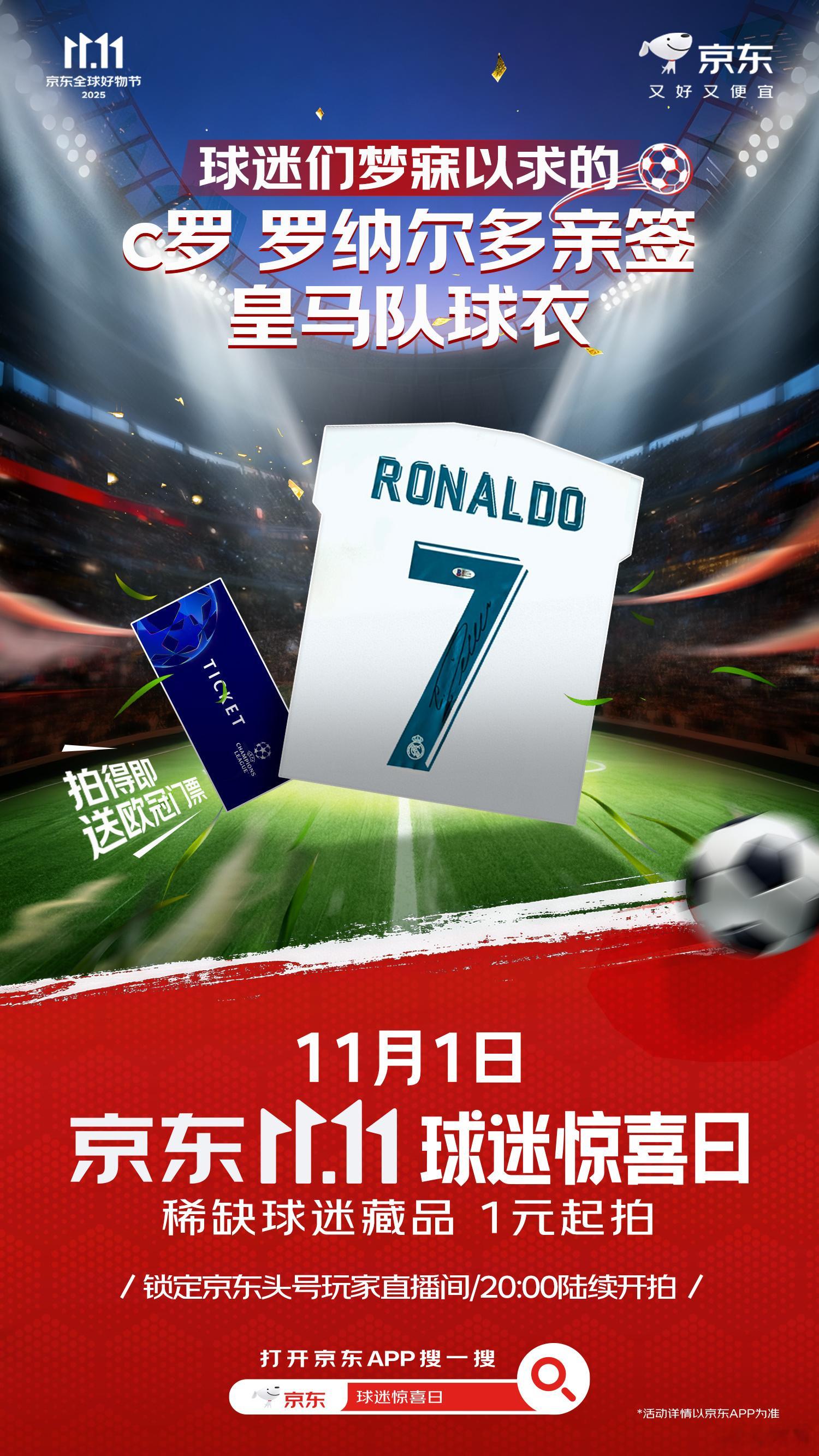 京东拍卖放大招了!球迷朋友们看过来看过来~1元起拍炸场!梅西C罗等传奇球星签名球衣+欧冠门票在京东重磅上线,惊喜连连,11月1日即今晚20点准时开抢!
