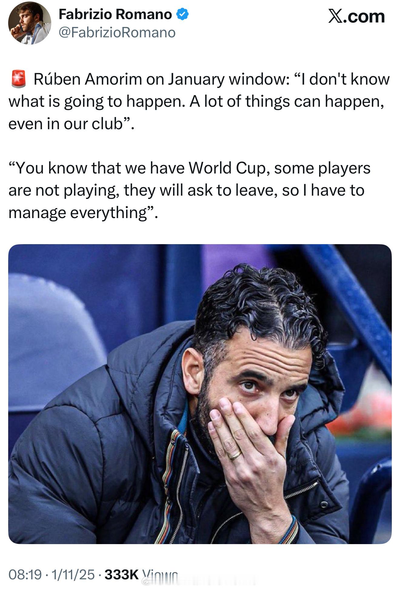 阿莫林谈冬季转会窗:“即使在曼联也会有很多事发生,我目前不太确定。考虑到明年的世界杯,有些球员目前没有比赛时间,会要求离队,我需要处理这些事。”