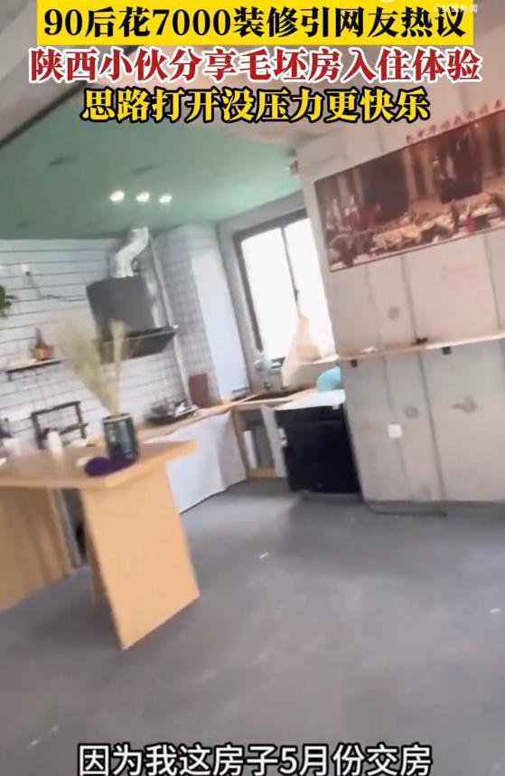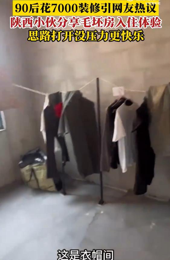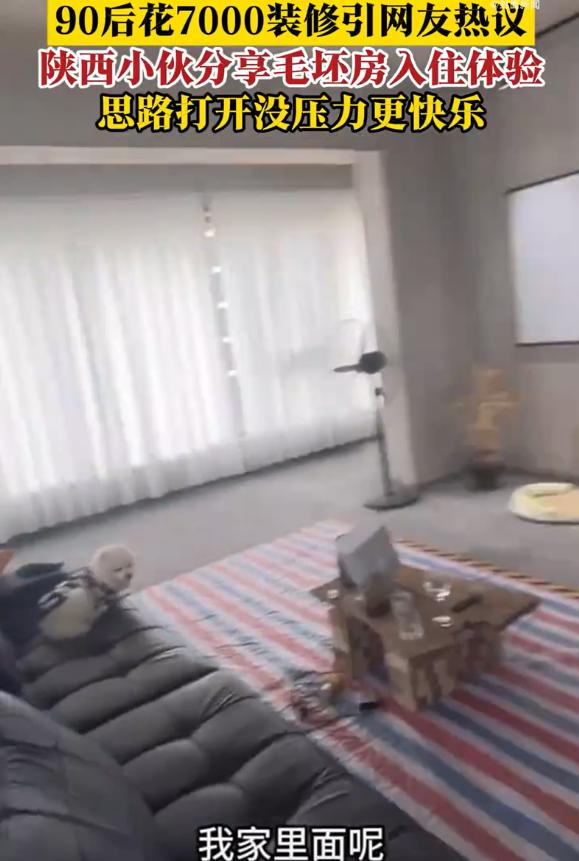 “这是真会过日子!”陕西渭南,一名90后男子新房交付,可邻居家里还在装修,他却一个月后直接入住了毛坯房,装修也仅仅花了7000元,虽然是“穷装修”,但却创意十足,网友:这是真正的0装修,0甲醛。   陕西渭南的新小区里,邻居们还在为装修噪音吵得头疼,90后丁先生已经拎包住进刚交付一个月的毛坯房。,   别人花十几万装的样板间还没成型,他只花7000块,把水泥房改出了专属味道,网友刷到视频直呼“真正的0装修、0甲醛”。   丁先生单身,买房掏空积蓄,索性放弃传统装修套路,7000块一分一厘都花在刀刃上:卫生间先砸钱做1.8米高防水,再铺地砖,光这两项就占1500块,他说“这钱省不得,漏了更麻烦”。   水电局部改改,留足6个插座,明管布线省工又好修,才花800块。   地面没铺瓷砖,买桶灰色环氧地坪漆自己滚两遍,800块就搞定,光脚踩上去滑溜溜的,比地毯还舒服,灰尘也少了大半。   墙面不刮腻子,直接刷层罩光漆,500块挡住起灰,水泥肌理反倒带出点侘寂风。   最绝的是收纳,他在墙上钉几根横杆,拉上麻绳,挂S型挂钩和塑料盒,50块就替代了几千块的衣柜,衣服挂得一目了然,想改布局随时动。   氛围全靠灯光撑,客厅天花板装三盏可调角度的射灯,总共花不到200块,暖光一打,原本暗沉的水泥墙立马显出层次,网友说“这哪是毛坯房,像艺术馆”。   家具全是淘来的实惠货:闲鱼300块收个五斗柜,锯短点塞飘窗当收纳;4块木托盘架上床垫,800块拼出能储物的床。   阳台铺块仿真草皮,缠串LED灯,300块变休闲角,白墙直接当幕布投电影,追剧体验一点不差。   他自己动手省人工费,借邻居电钻水平仪(押金200块用完就退),同城二手平台砍价淘家具,最后花99块测甲醛,0.03的数值达标,直接拎包入住,邻居路过门口好奇张望,他笑着招呼,说“住得舒服比啥都强”。   网上吵翻了天,有人质疑“太简陋,朋友来没面子”,更多人却羡慕:“买房已经够累,何苦为装修负债”“这才是不被消费主义绑架”。   现在装修动辄十几万,装出来千篇一律,丁先生却用7000块装出了自己的节奏。   其实这哪是“穷装修”,是年轻人的务实,家不是用来炫耀的样板间,是自己住的窝,先住进去,边住边改,既减轻压力,又能按生活习惯慢慢完善。   丁先生的房子里没有豪华装饰,却处处是过日子的巧思,这才是真的会生活,房子不必一步到位,舒服、适合自己,比啥都重要。