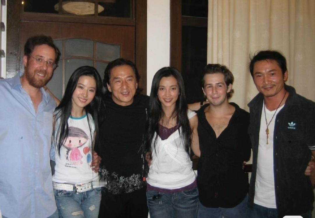 成龙大哥搂着刘亦菲的肩膀,而刘亦菲则是单手叉腰扶在成龙大哥腰后