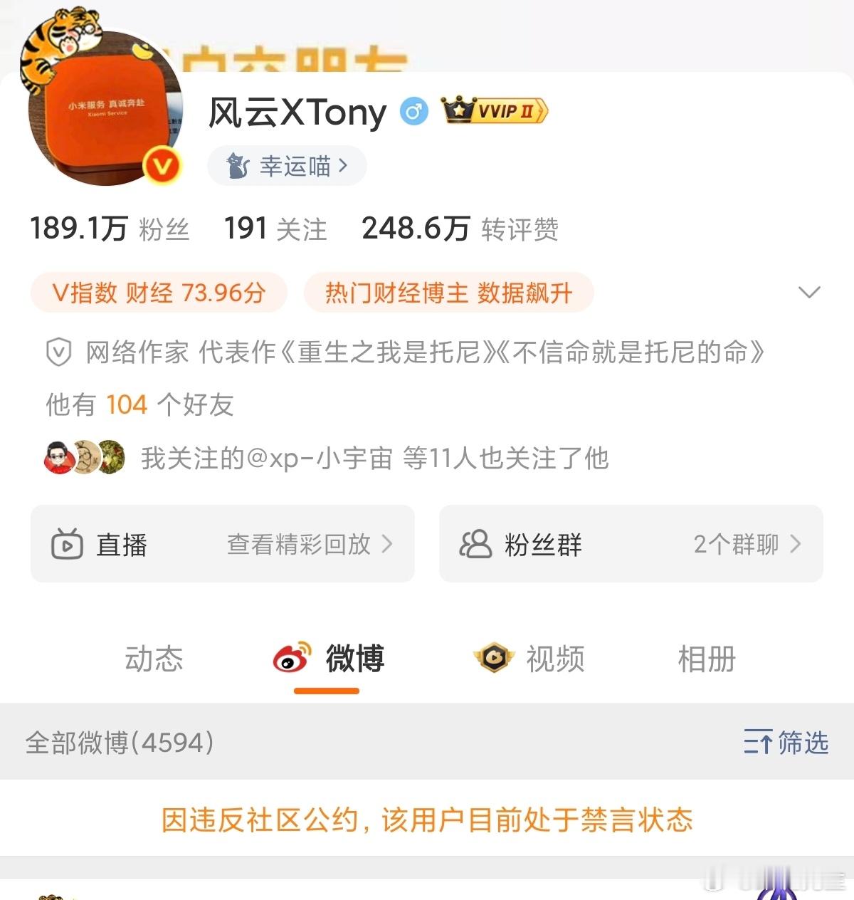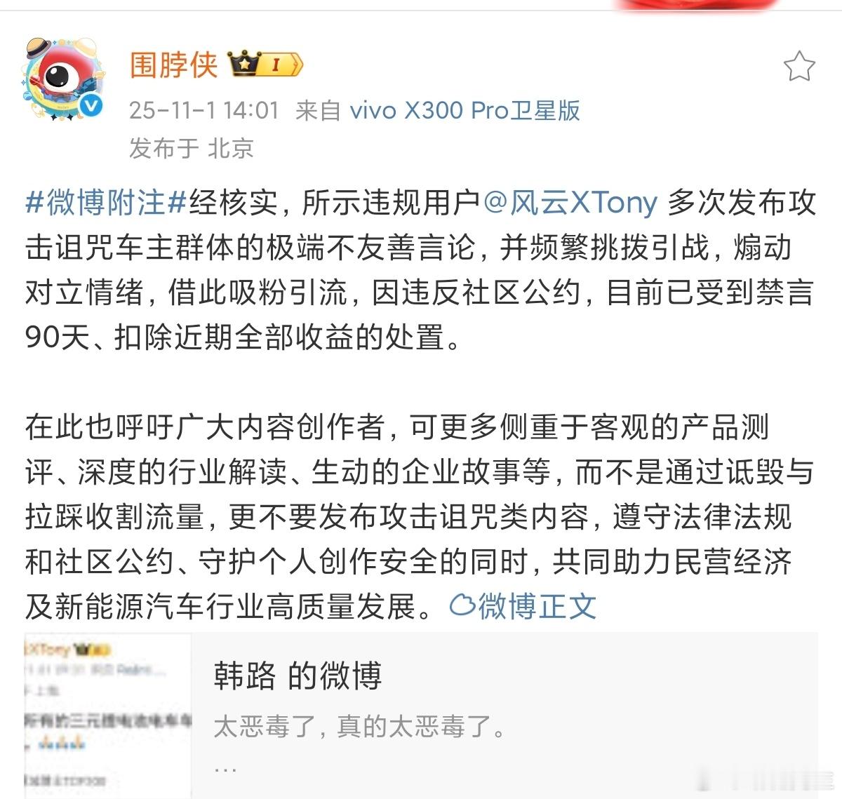 “风云XTony”因频繁引战、煽动对立,被禁言90天。