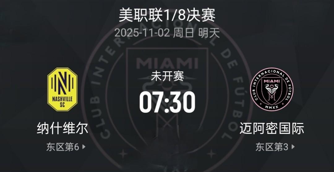美职联季后赛第一轮第二场比赛开打了。 北京时间11月2号早上7点30分,迈阿密国际将客场挑战纳什维尔,这场要是赢了,迈阿密国际能直接晋级下一轮,输了还会再踢一场,采用三局两胜淘汰制,平局直接点球大战定输赢。 或许明天之后,将有球队被淘汰,进入了美职联真正的休赛期了。 期待有梅西的比赛吧,赛程密集时觉得老头太累了,赛程恢复正常,又有点无球可看的感觉。