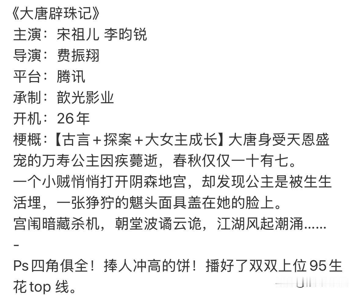 11月1日,宋祖儿李昀锐将合作《大唐避珠记》,古言探案大女主成长剧,演员阵容,班底阵容,剧本题材,都不错,很多人觉得这是冲咖的好饼,但我并不这样觉得,单看这三个标签,就感觉已经落入了俗套,毕竟这类题材的剧,内娱有不少,还扑了不好,另外年底还有杨紫的大女主探案剧《青簪行》要播出,这题材市场属于8分饱,新鲜感不太够 两位主演合作是很好的,如果有其他很好的题材就更好了,这题材不够新,两人都是无缝进组,剧播出的间隔不会长,如果题材不够新颖,就会感觉大家看在演类似角色~ 两人其实可以试试现代剧