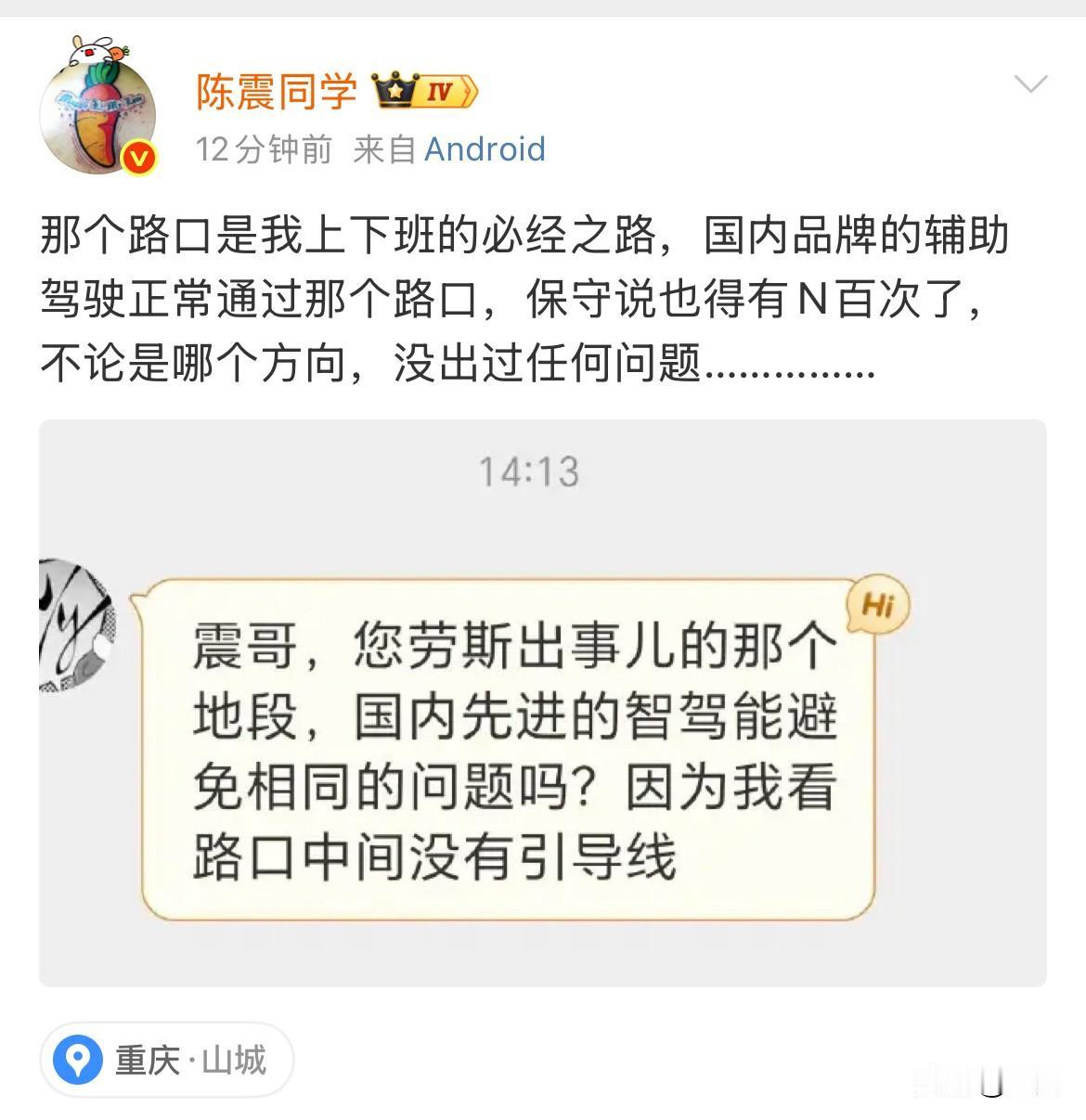 陈震: 我出事那个地方,开国内辅助驾驶,至少经过上百次,没出过任何事儿! 有热心的粉丝专门去那个地方看了一下,他发现这个地方的路口中间居然没有引导线,所以他想问一下陈震,同样的问题,我们国内的辅助驾驶,能不能够避免在这个地方,出现劳斯莱斯辅助驾驶存在的那种失去控制情况? 陈震表示这个地方是他的必经之路,这么多年来他开过无数次,而驾驶我们国内的汽车品牌,启动辅助驾驶系统,走这条路至少也要上百次了,从来没有出任何问题。 不管是正方向走还是反方向走,不管是驾驶他有的蔚来、小鹏、尊界、享界等等品牌,它都走过无数次这条路压根就没有出过事儿,但上次他开劳斯莱斯,同时开启辅助驾驶系统,在这个地方他就出事儿了,这你受得了吗?