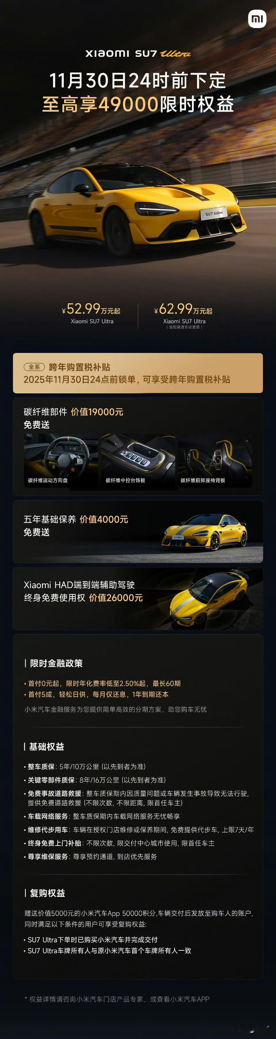 雷军:小米汽车11月购车权益来了,11月底前锁单,全系车型可享受跨年购置税补贴。邀请好友锁单还有积分奖励。 随着雷军把这条消息放出来,这基本上也就意味着从六月份这个车开卖,一直到现在,除了一开始的那些碳纤维护板之类的权益没有,其他的权益基本上一直在延续。 就是说最开始的那些抢先版用户还是享受到了比较实在的体验,但是现在买基本上和后来买的消费者就没啥区别了。 而且马上到年底了,他们又要销量,所以估计这个权益到十二月份依然不会变。再加上现在他们每个月的交付量突破了四万台,有可能在下个月这个数字还会往上面冲一冲,所以在卖得好的同时,他们也要迅速把车交到用户手上才行。 当然,他弄的这种送积分对普通用户来说也是很实用的,毕竟积分可以在他们的商城里面买东西,完全可以当成现金用。