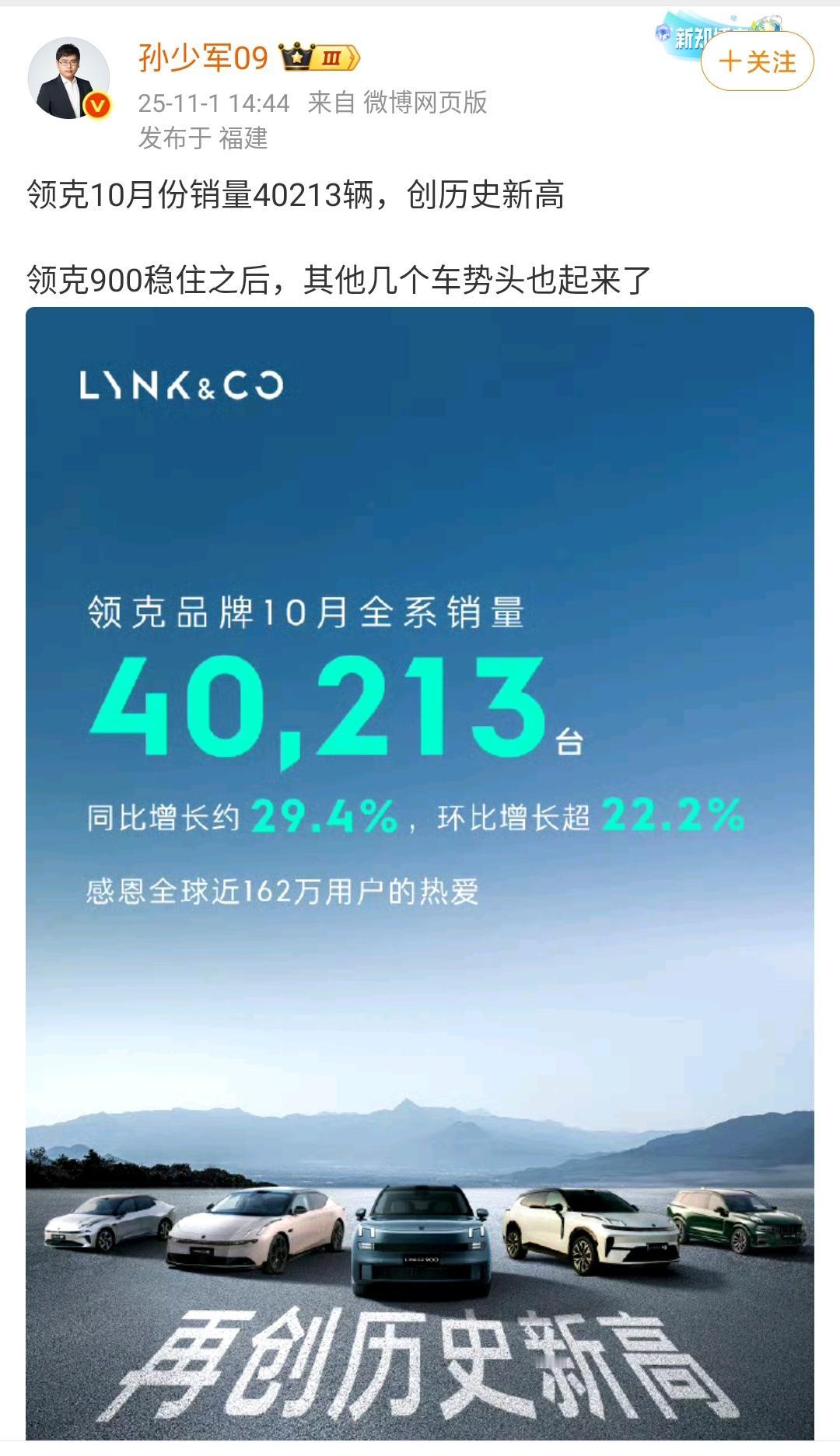 孙少军:领克10月份销量40213辆,创历史新高! 领克900稳住之后,其他几个车势头也起来了,领克汽车需要尽快把其他产品的竞争力也拉上来,从这上面也能看出领克900的竞争力是真的强。 其实现在大家都有这种印象,都喜欢买销量比较好的,因为销量差的东西,做企业的肯定会迅速进行换代换成最新款的。
