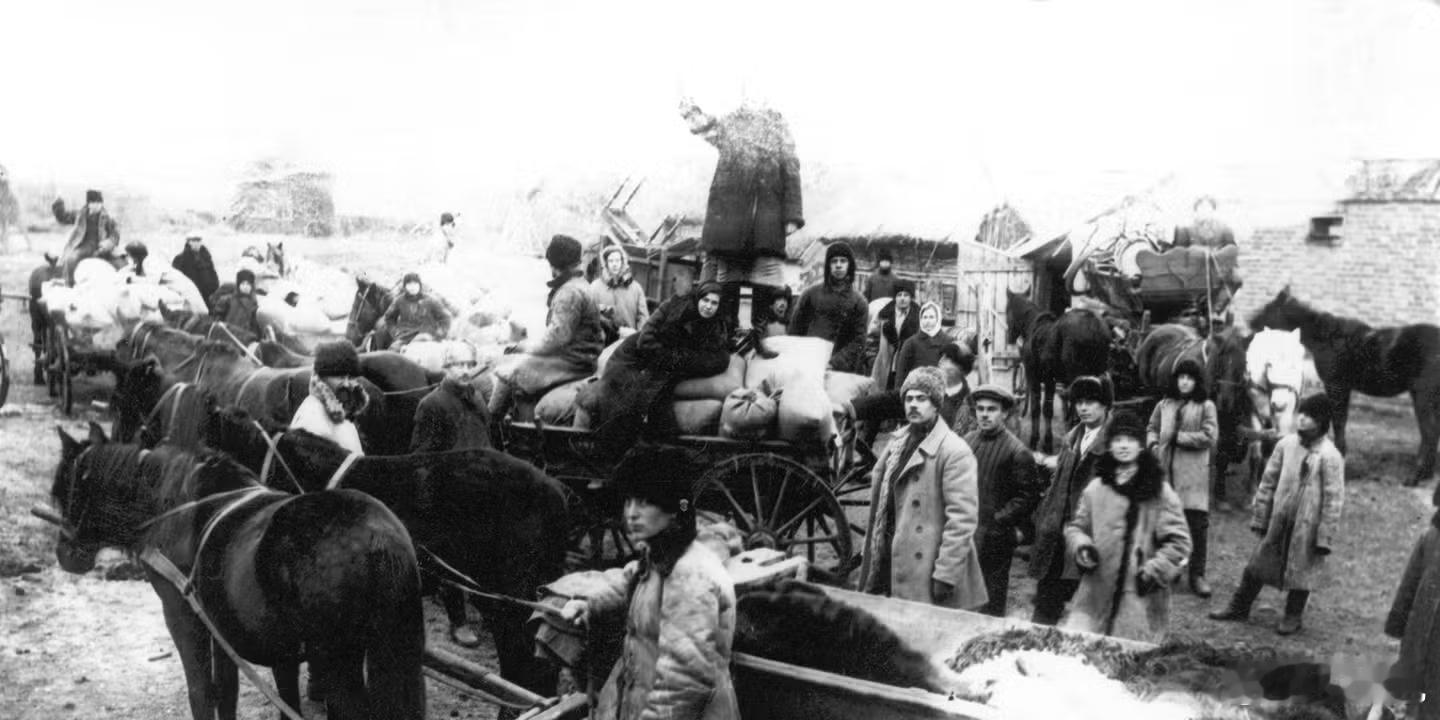 集體農莊、計劃經濟、統一徵購,構建了一套以控制為核心的分配體系。自由市場被消滅,私有財產被剝奪,資源只流向服從者,飢餓則成為普通人的常態。(據 Lumen Learning 教材估算,僅僅1930‑1933 年期間,前蘇聯範圍內因集體化與糧食征購政策造成的饑荒,死亡人數約在 500 萬至 1000 萬 人之間。)