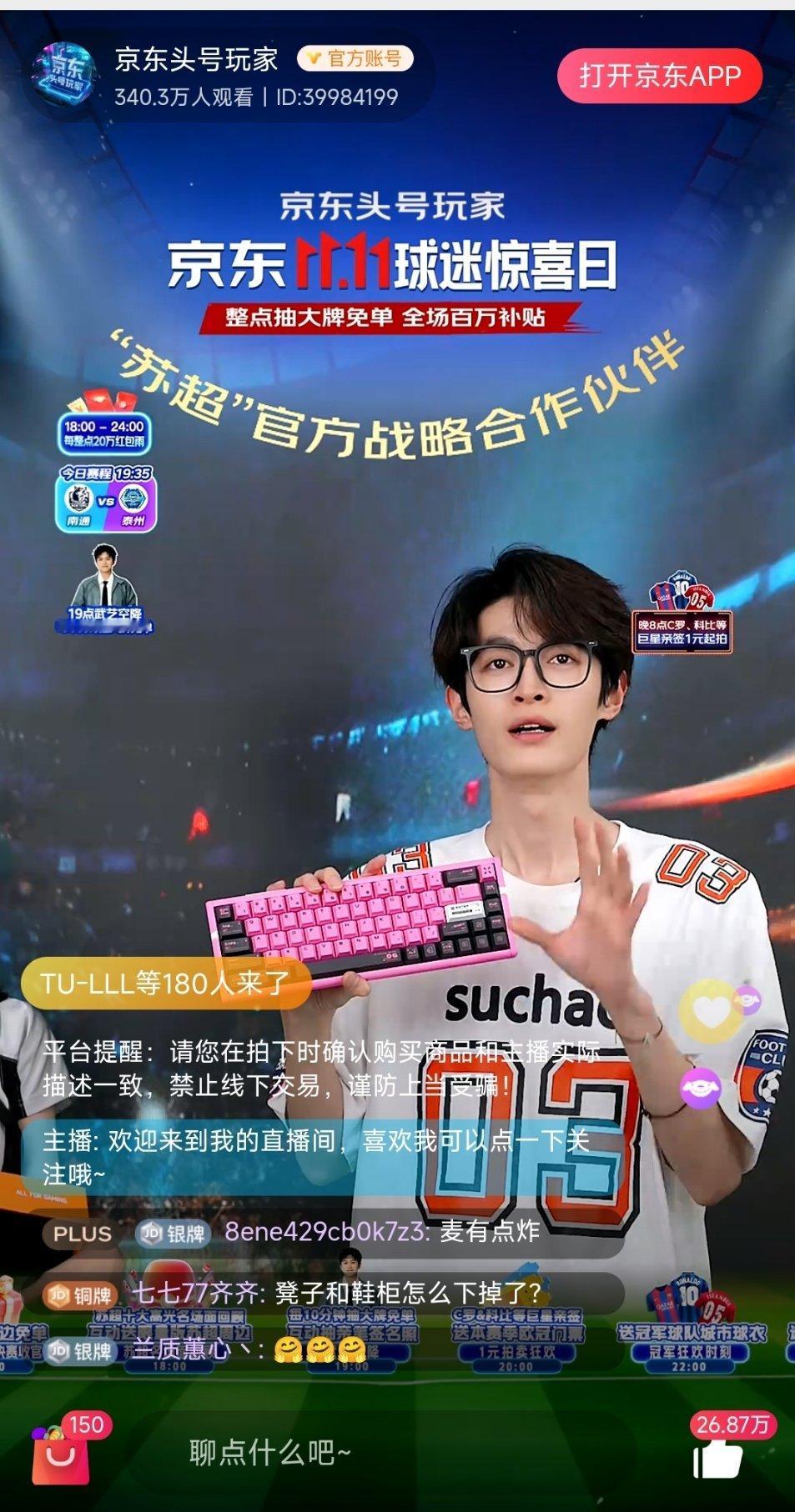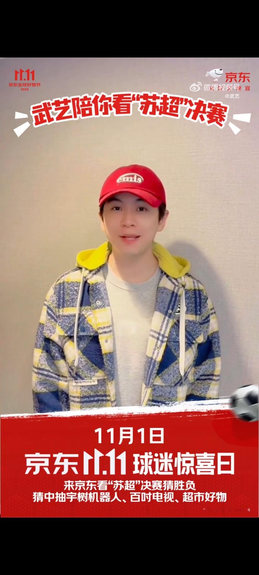 11月1日京东11.11球迷惊喜日,由京东陪你一起关注苏超最终战。无论是场上还是场下,京东都和球迷一起 关注最终冠军的诞生。观看直播,享受苏超那份独特友谊和竞技精彩的同时,还有机会猜胜负,有机会获得多种幸运好礼。更有武艺空降京东头号玩家直播间,和大家一起看球,届时也会有好礼相送!