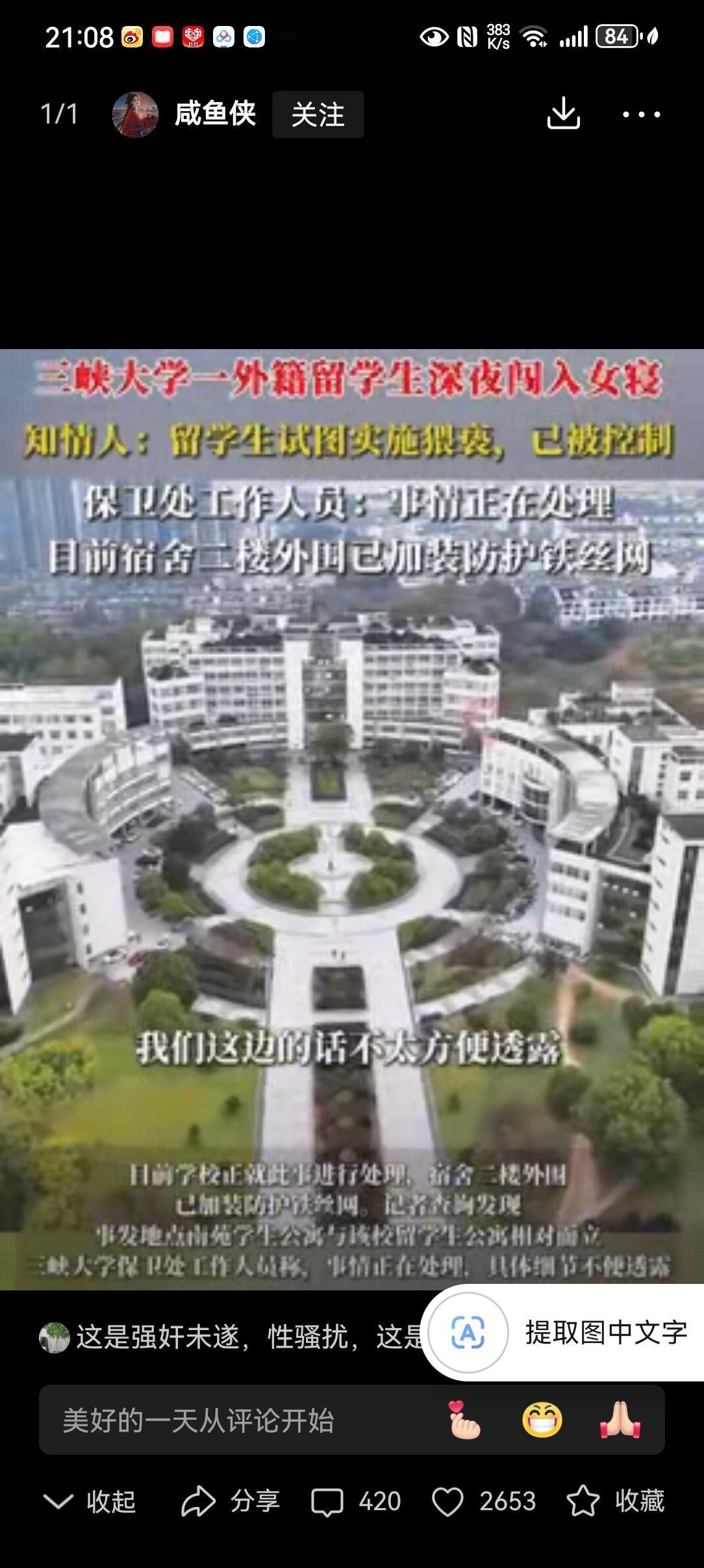 “简直太放肆了!湖北宜昌,一女大学生在宿舍睡觉,夜里忽然感觉有人在摸她,她睁开眼睛一看,床边竟然有个大黑影,女生吓得大叫,下一秒就被打了,谁知,接下来学校的处理,让全校学生都拍手叫好! 三峡大学女生宿舍,晾在阳台的内衣接二连三失踪,风刮、鸟叼、灵异事件的猜测,在女生间越传越玄。 学校装了带刺防护圈,本以为能安稳睡觉了,没承想更吓人的在后头。 2025年10月26日凌晨,二楼一女学生睡得正沉,忽然有只手摸向她的贴身衣物。 睁眼瞬间,床边的大黑影像块乌云压来,女生惊声尖叫,换来的却是一巴掌和几道血痕。 黑影妄图捂嘴,舍友被惊醒开灯,陌生男子的身影暴露,众人边跑边喊“救命”。 在楼梯间,这人被众人擒住,只见皮肤黝黑带着外国口音,竟是学校的外籍留学生。 调查证实,他徒手爬墙翻窗,偷内衣还深夜袭扰女生,先前的怪事全是他作祟。 全校哗然之际,学校的通报掷地有声:直接开除学籍,连夜加装防护铁丝网。 “不管哪国来的,在中国就得守中国的规矩!”网友的呼声戳中人心。 别拿“留学生身份”当挡箭牌,法律面前从无特殊,犯了错就该一视同仁。 女生宿舍安全容不得半点马虎,防范要做在前头,遇可疑情况别忍别慌,及时求助才是正道。 在中国的土地上,谁也不能逾越底线,这既是对受害者的交代,也是法治该有的硬气。