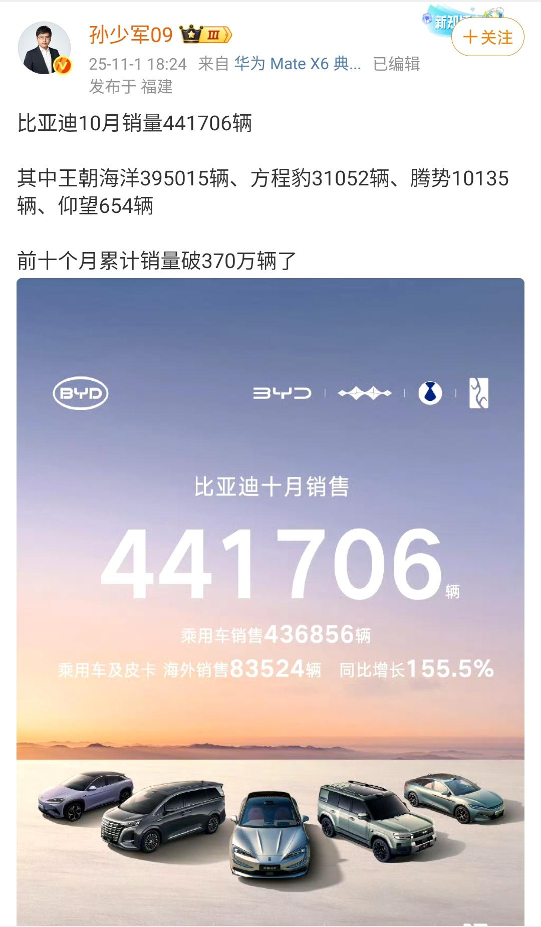 孙少军:比亚迪10月销量441706辆! 其中王朝海洋395015辆、方程豹31052辆、腾势10135辆、仰望654辆,前十个月累计销量破370万辆了。 按照这个成绩计算,接下来还有两个月的时间,比亚迪年销量很有可能会超过460万辆的成绩,这个成绩又刷新了中国汽车品牌的之最。 从目前看,能超过比亚迪的只有比亚迪汽车一家,其他车企远远没有达到比亚迪的成绩。 希望接下来有越来越多的车企可以像比亚迪一样,成为一家全球销量都非常领先的巨型汽车品牌。