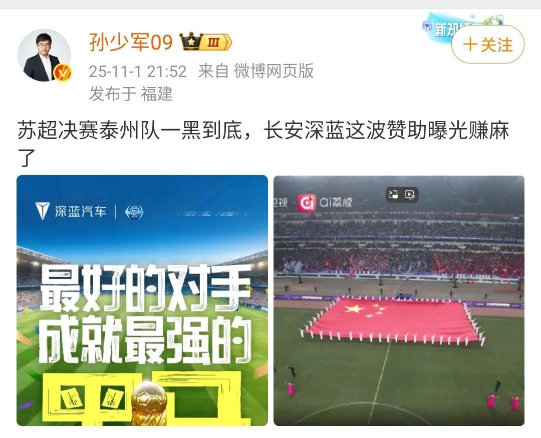 孙少军:苏超决赛泰州队一黑到底,长安深蓝这波赞助曝光赚麻了 ! 这一次长安深蓝是提供的三年免费使用权,不知道这三年免费使用权能不能折现,如果折现的话还挺好的,与其他车企10年免费使用权不同,三年使用权意味着到时候车企还要回收这辆车。 各位是怎么看的?欢迎评论区留言。