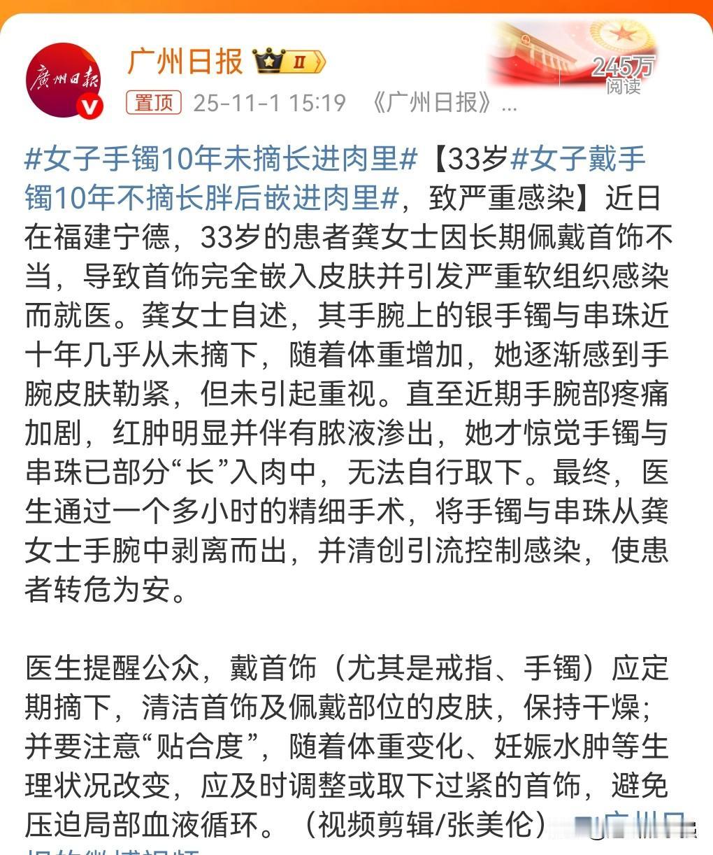 这也太离谱了吧,反应这么迟钝的吗? 如果不是在网上亲眼所见,我是万万不敢相信竟然有这种事情发生。 11月1日(报道时间),女子手镯10年未摘长进肉里。 是因为女子长胖了。 让我不理解的是都“长”到肉里面了,那应该会痛。为什么到化脓了她才知道呢? 幸亏医生医术高,解决了这一问题。