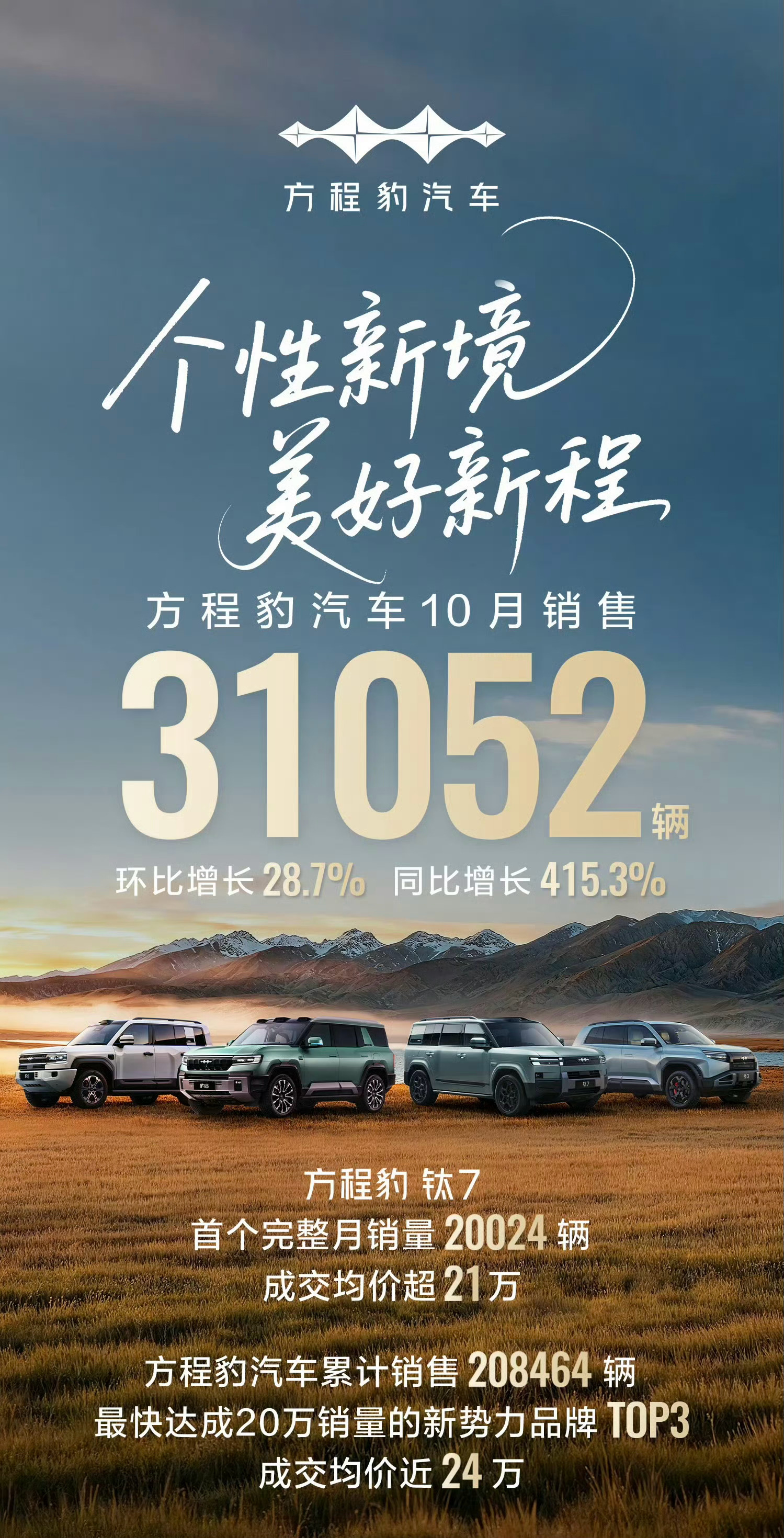 比亚迪10月销量创年内新高,超44万辆,方程豹表现强劲,销量超3.1万辆!