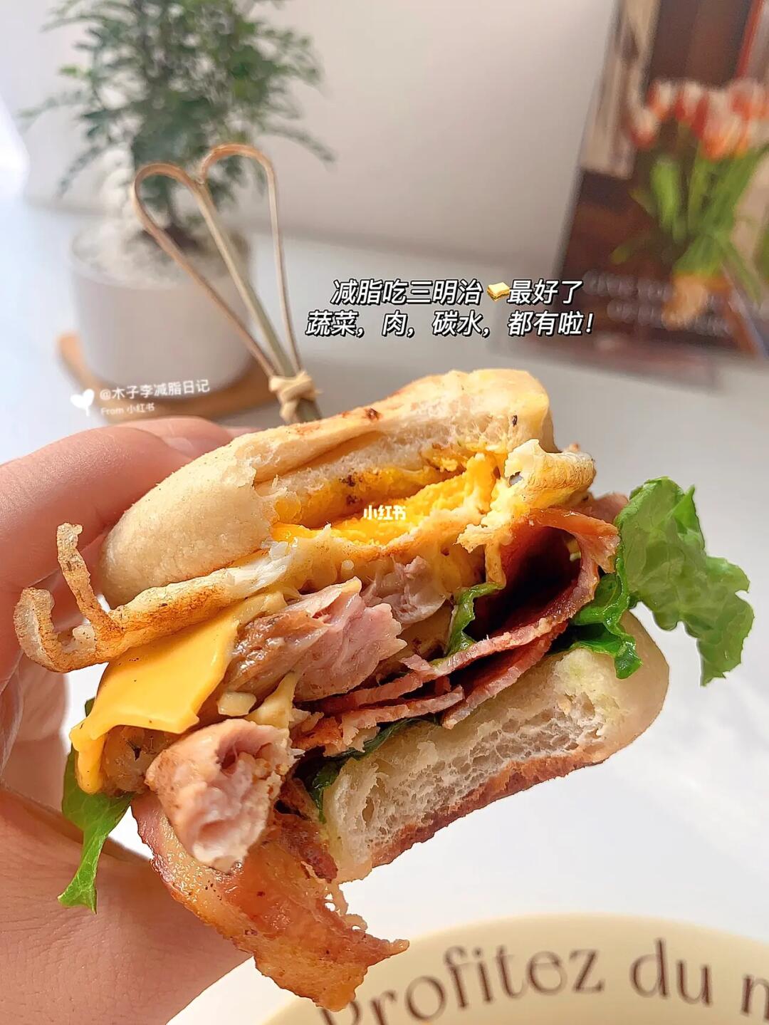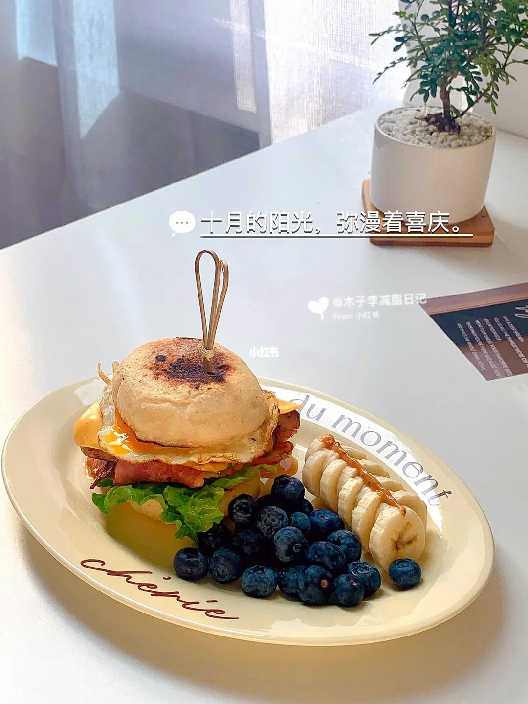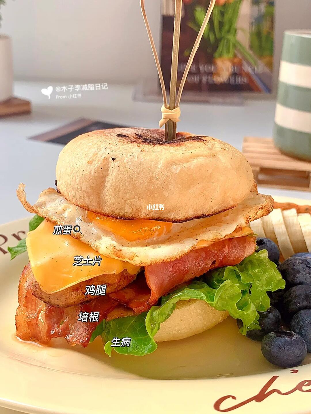 2022.10.4减脂饮食记录 🔸初始体重120斤 🔹现重89斤 ——————————————————————— 🥯早餐:麦芬三明治|挂耳咖啡|蓝莓|香蕉花生酱 💧每天喝水2000ml➕ 🏃♀️运动:不动 ———————————————————————— 最近特别喜欢三明治🥪把喜欢吃的叠高高、美味又减脂! ▪️麦芬复烤下,放上生菜、培根🥓、芝士鸡腿、最后加个煎蛋就可以了!饱腹又满足~ 我吃三明治不爱加酱[抠鼻R]