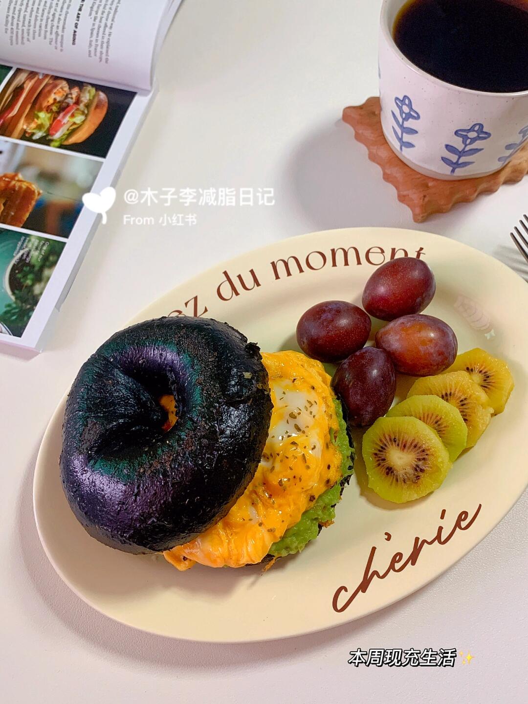 🥯早餐:牛油果滑蛋肉松贝果|西梅|猕猴桃🥝|黑咖啡