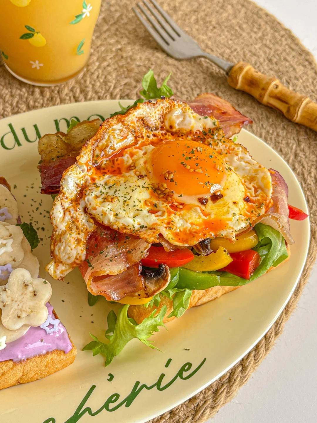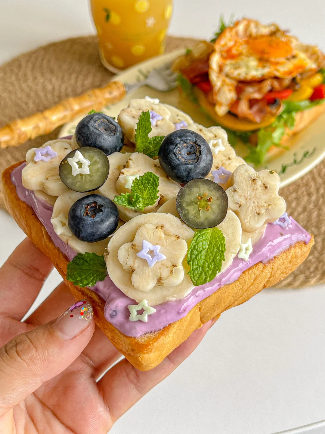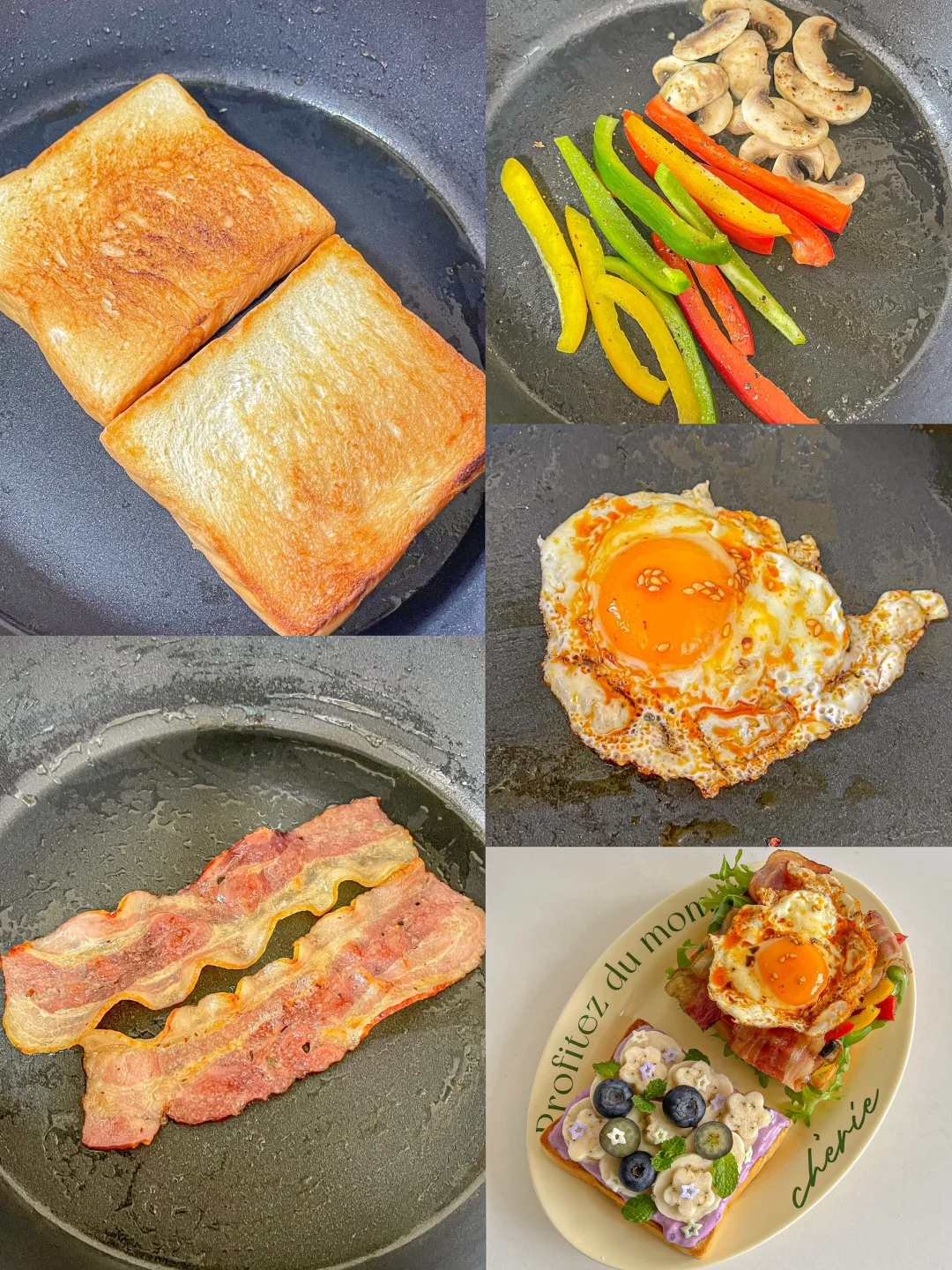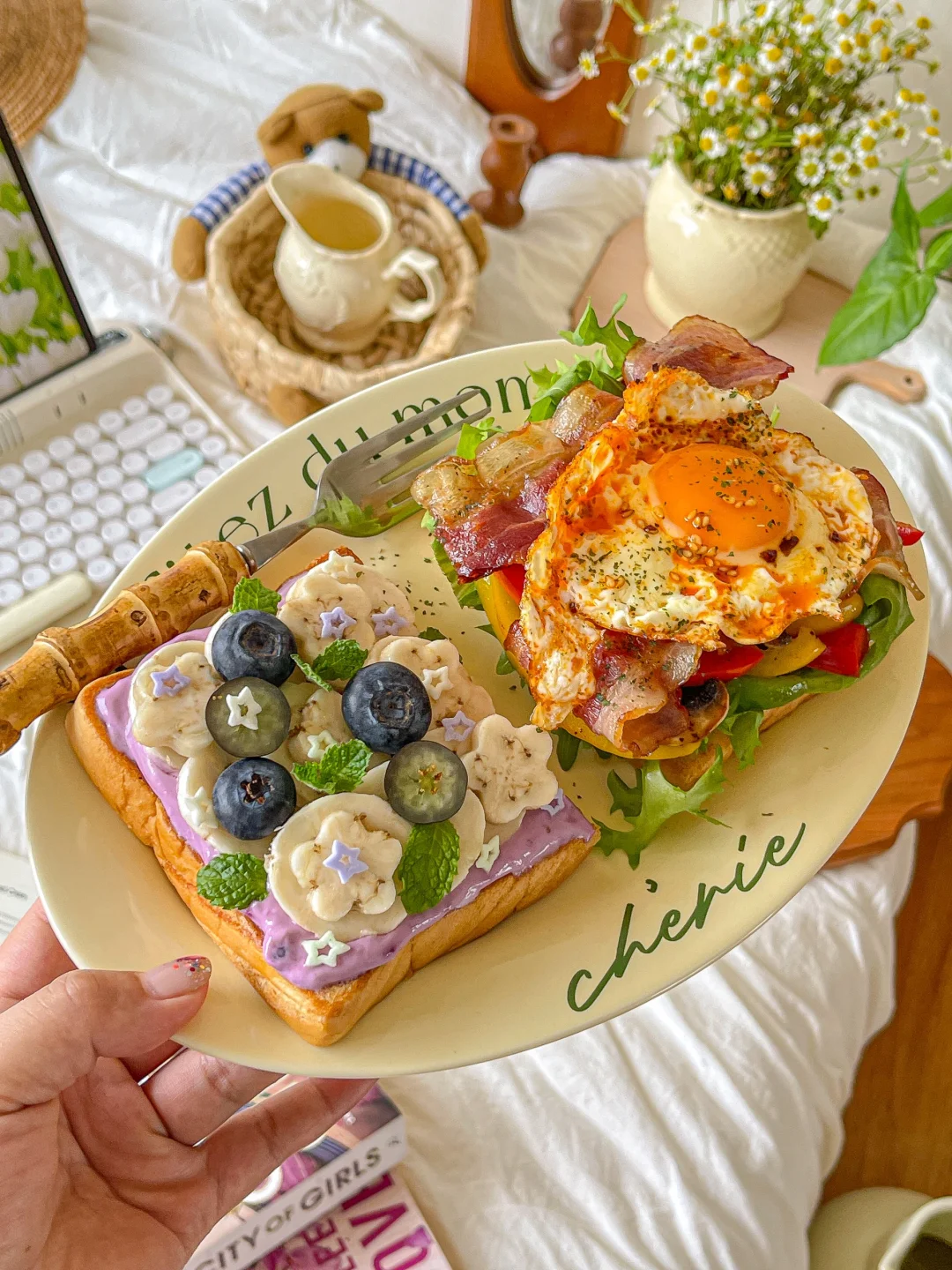 简单一人食早餐灵感! 经典吐司三明治 咸甜永动机! 食材:🫐 吐司➕蓝莓希腊酸奶➕香蕉➕蓝莓 吐司➕苦菊➕彩椒➕口蘑➕培根➕油泼辣子煎蛋 吃不腻的吐司三明治!两个口味都巨丰富好吃 做法简单快手 !家里有什么食材就加什么食材 小白也可以轻松搞定👌🏻 咖啡豆喝完了 新买的还没到 只能苹果汁应付一下噜!