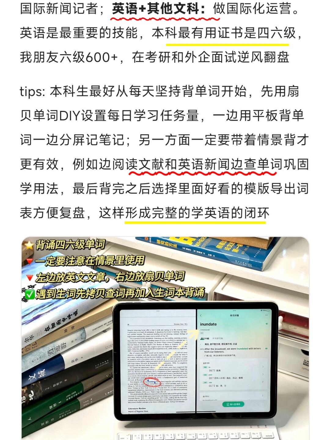 本科能把握的最有用证书是四六级,我朋友就是六级600+,在考研和外企逆风翻盘。本科生从每天坚持背单词开始,先用扇贝单词DIY设置每日任务量,一边用平板背单词一边分屏记笔记;另外要带着情景背才更有效,例如边阅读文献和新闻边查单词巩固学用法