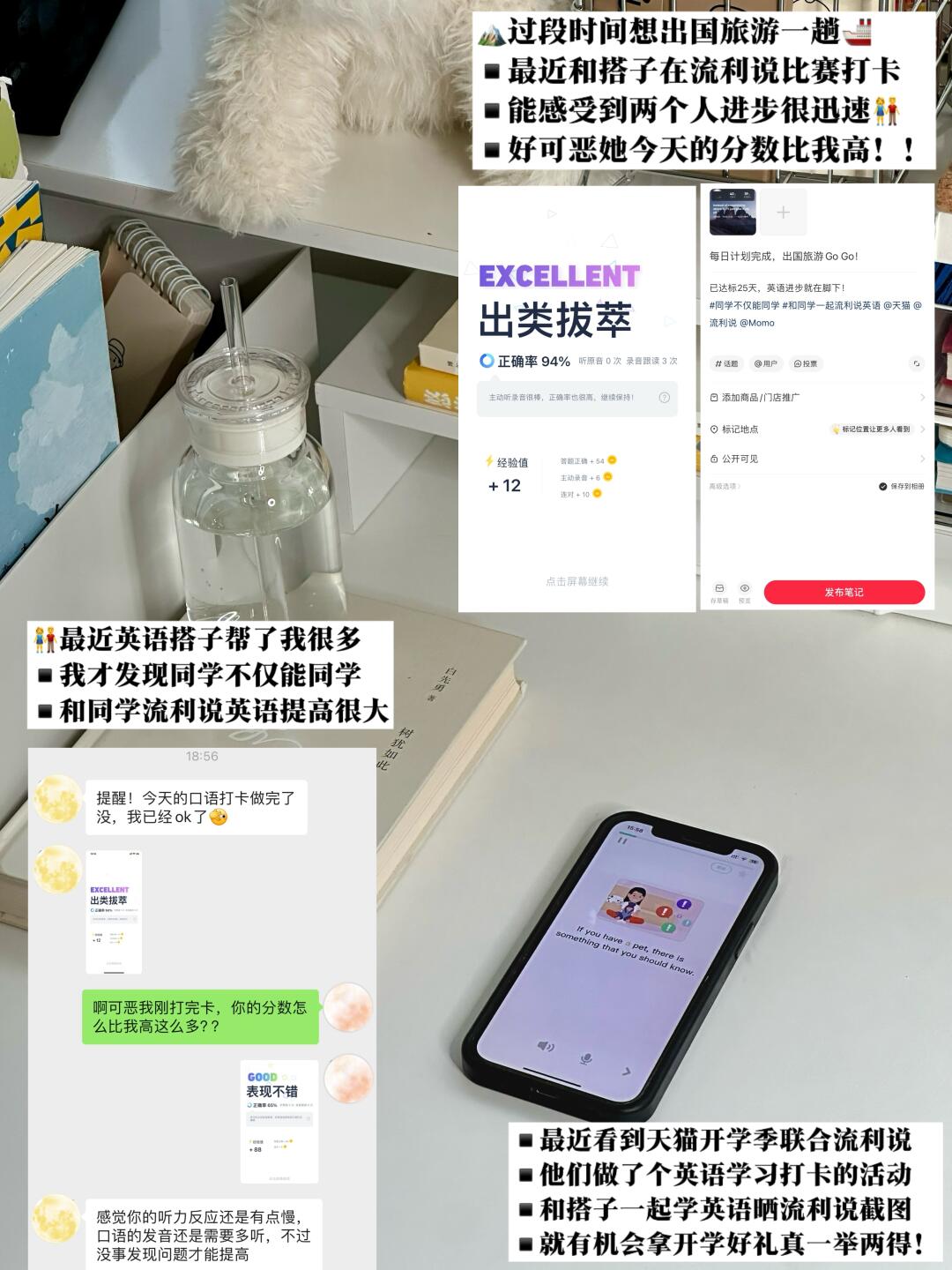 ▪️天猫开学季同学不仅能同学 联合流利说做了个英语学习打卡活动,和搭子一起学英语,晒流利说学习截图就有机会拿开学好礼,一举两得!我过段时间准备出国旅游,所以最近一直和搭子互相督促学英语,每天学完打卡,我俩进步都还挺明显🏃♂️➡️