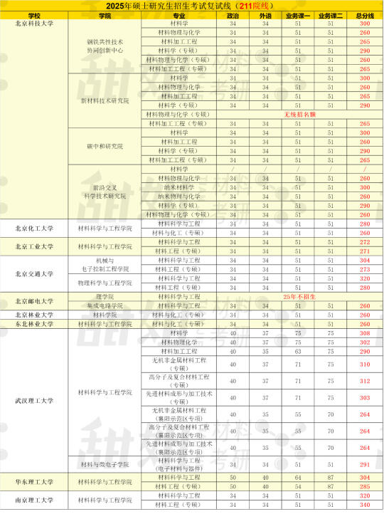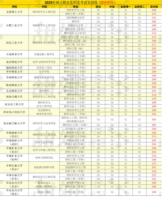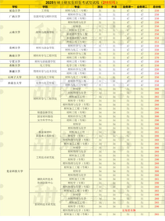 211院校的复试线已经公布啦,甜姐为大家汇总好了! 大部分院校的复试已经结束了,拟录取也陆续出炉,26的同学也可以多关注一下,看看你的心仪院校今年的招生录取情况哦! 注意由于招生计划名额限定以及考生分数差异情况,部分学校的复试线于进复试最低分有差异,比如: 延边大学:25年复试线为250分,进入复试最低分为278分; 青海大学:25年复试线为250分,进入复试最低分为266分; 材料与化工 材料考研 25考研 考研复试线 材料复试线 211院校
