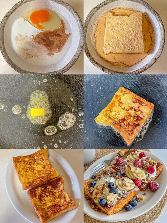 10分钟搞定营养早午餐 奶香味十足的法式吐司搭配热拿铁[偷笑R][派对R] 食材:🍳 吐司➕鸡蛋➕牛奶➕肉桂粉➕枫糖浆 做法:🥣 1. 准备蛋液:将鸡蛋打散,加入牛奶 枫糖浆 肉桂粉 搅拌均匀。 2.浸泡吐司:将吐司片放入蛋液中,确保两面都充分吸收蛋液。 3. 煎制吐司:在平底锅中加入少许黄油,将浸泡好的吐司片煎至两面金黄。 4. 装饰吐司:煎好的吐司上涂抹一层希腊酸奶 放上新鲜的香蕉和莓果 还有烘焙麦片 最后撒上一些糖粉即可!