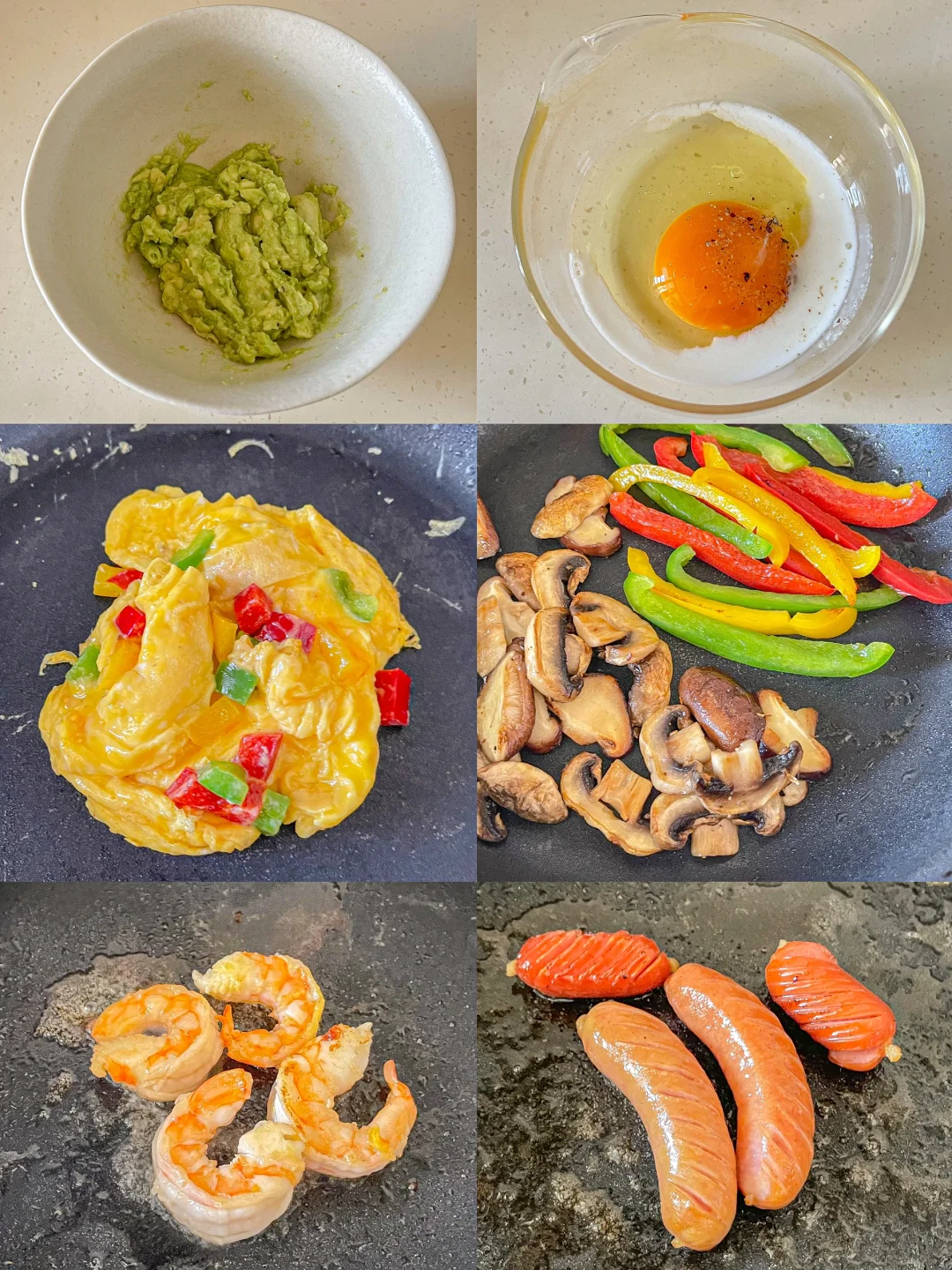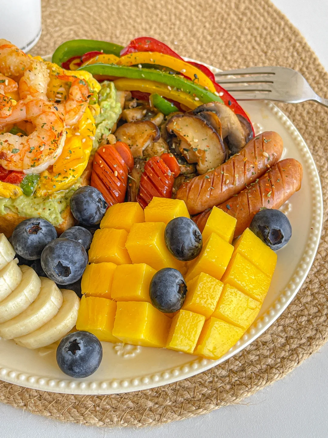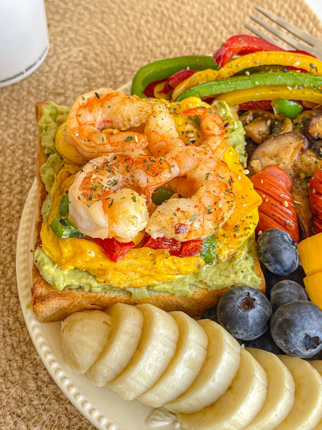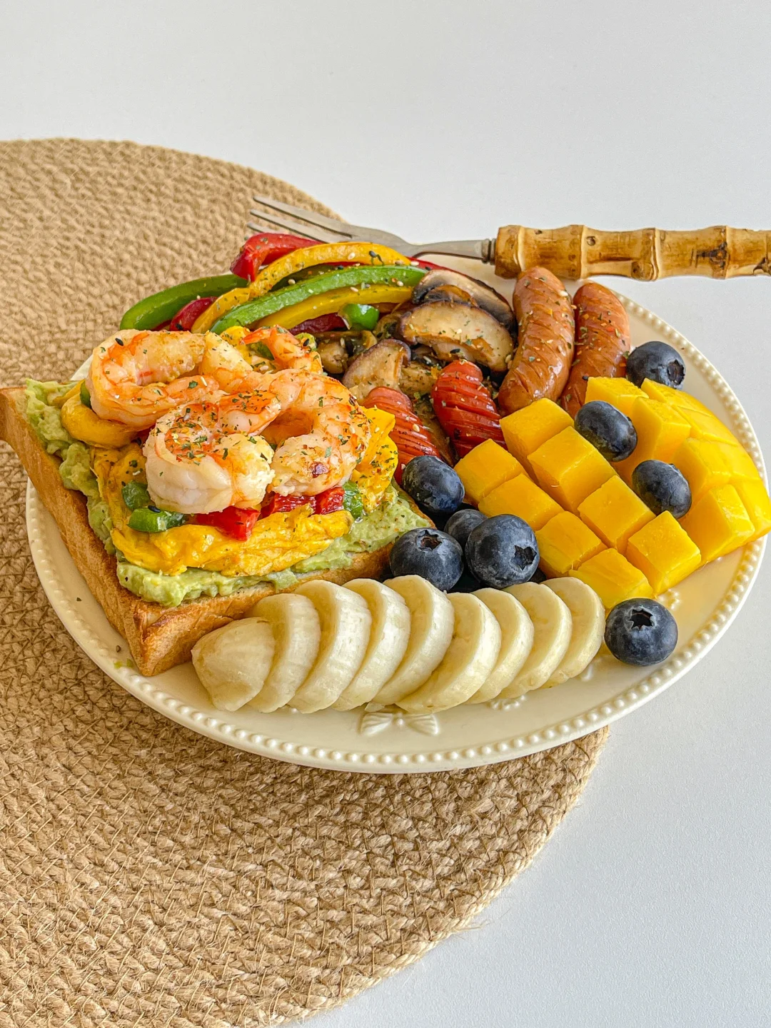 满满当当的元气早餐拼盘~ 把冰箱里面的边角料清空 😋 食材:🥪 吐司➕牛油果➕滑蛋彩椒➕虾仁➕烤肠➕蘑菇➕蓝莓➕香蕉➕芒果