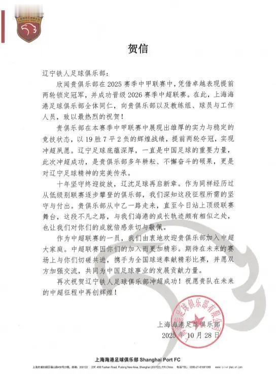 海港这样的举动太暖心了!申花应该学习!就是中超新军辽宁提前两轮拿到中甲冠军并且成功冲超后,海港发了贺信!相信辽宁也会非常感动!而申花没有发贺信!可以看出海港还是想的非常周到的!海港下一轮联赛也是冠军点对阵大连!而大连也是属于辽宁省!只要打平确保夺冠!