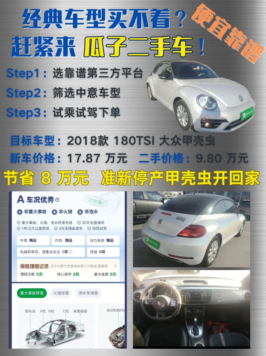 在这里,你能精准筛选出自己中意的车型,还能试驾后再下单。就像这辆2018款180TSI大众甲壳虫,新车17.87万元,我在瓜子二手车只需9.80万元,直接节省8万元,准新停产甲壳虫轻松开回家🚘