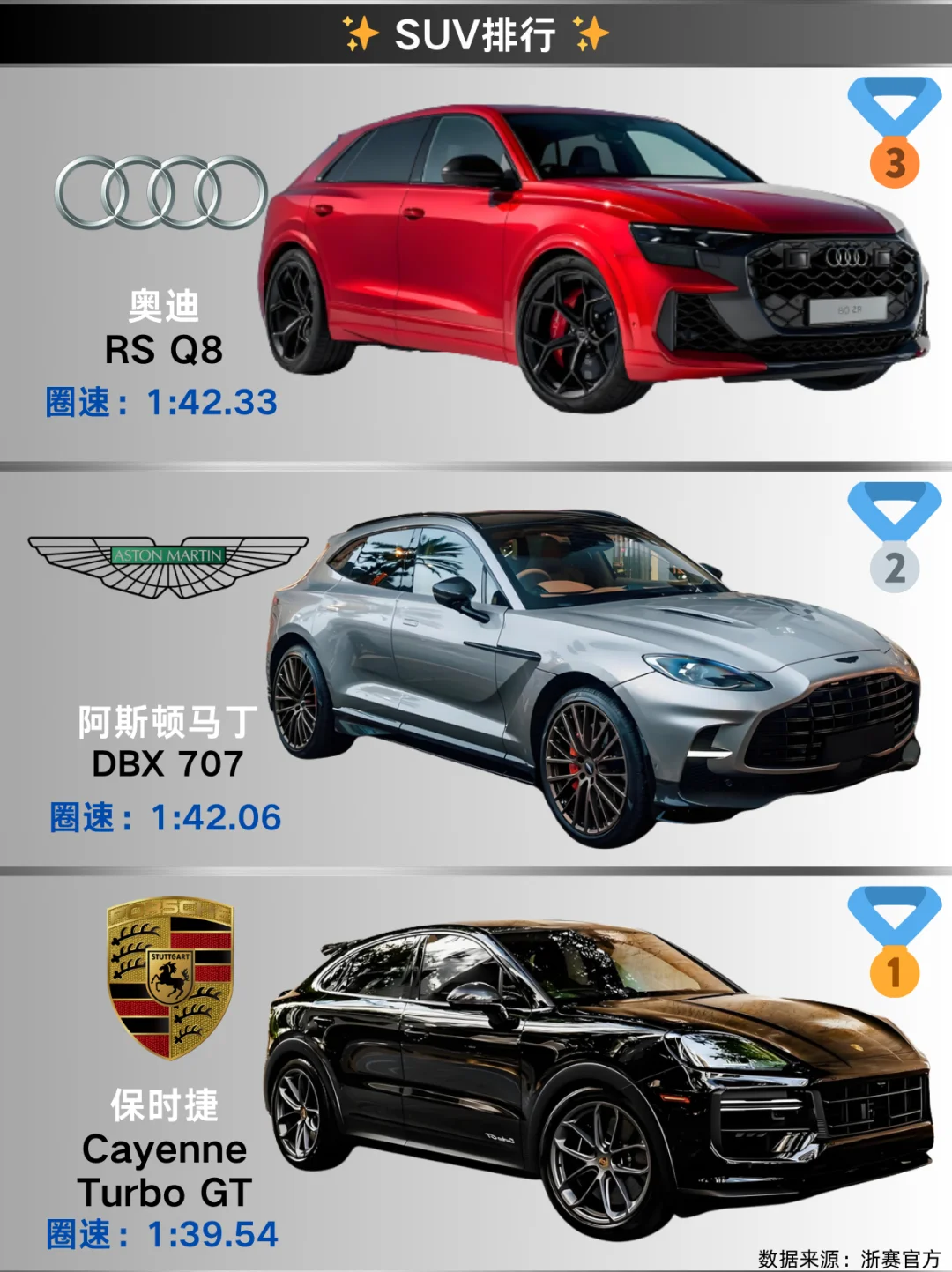 🥇保时捷 Cayenne Turbo GT:圈速 1:39.54 ,谁说 SUV 不能跑赛道?Cayenne Turbo GT 用实力打破质疑,兼具豪华与性能,在赛道上跑出了 SUV 的新高度。