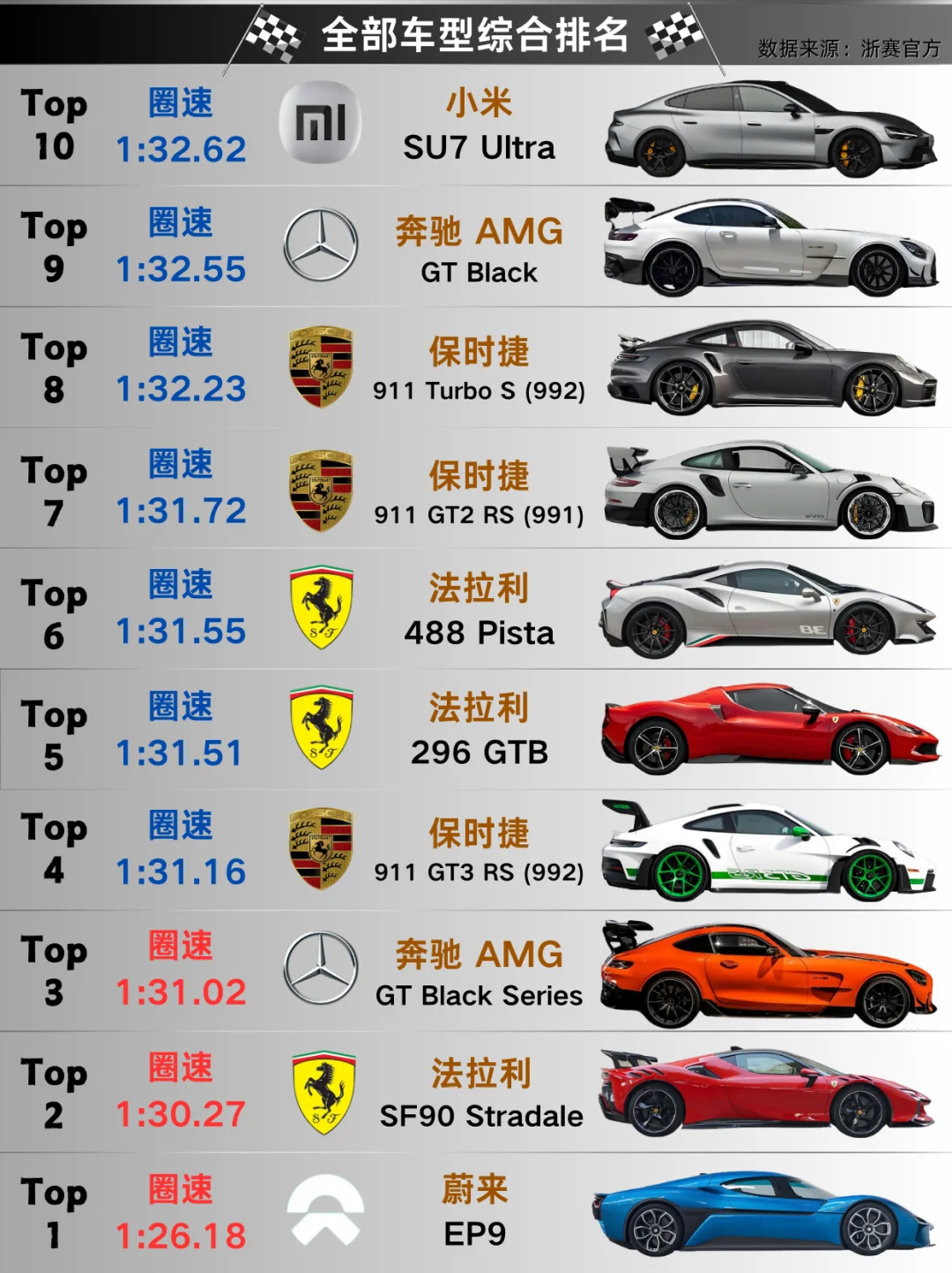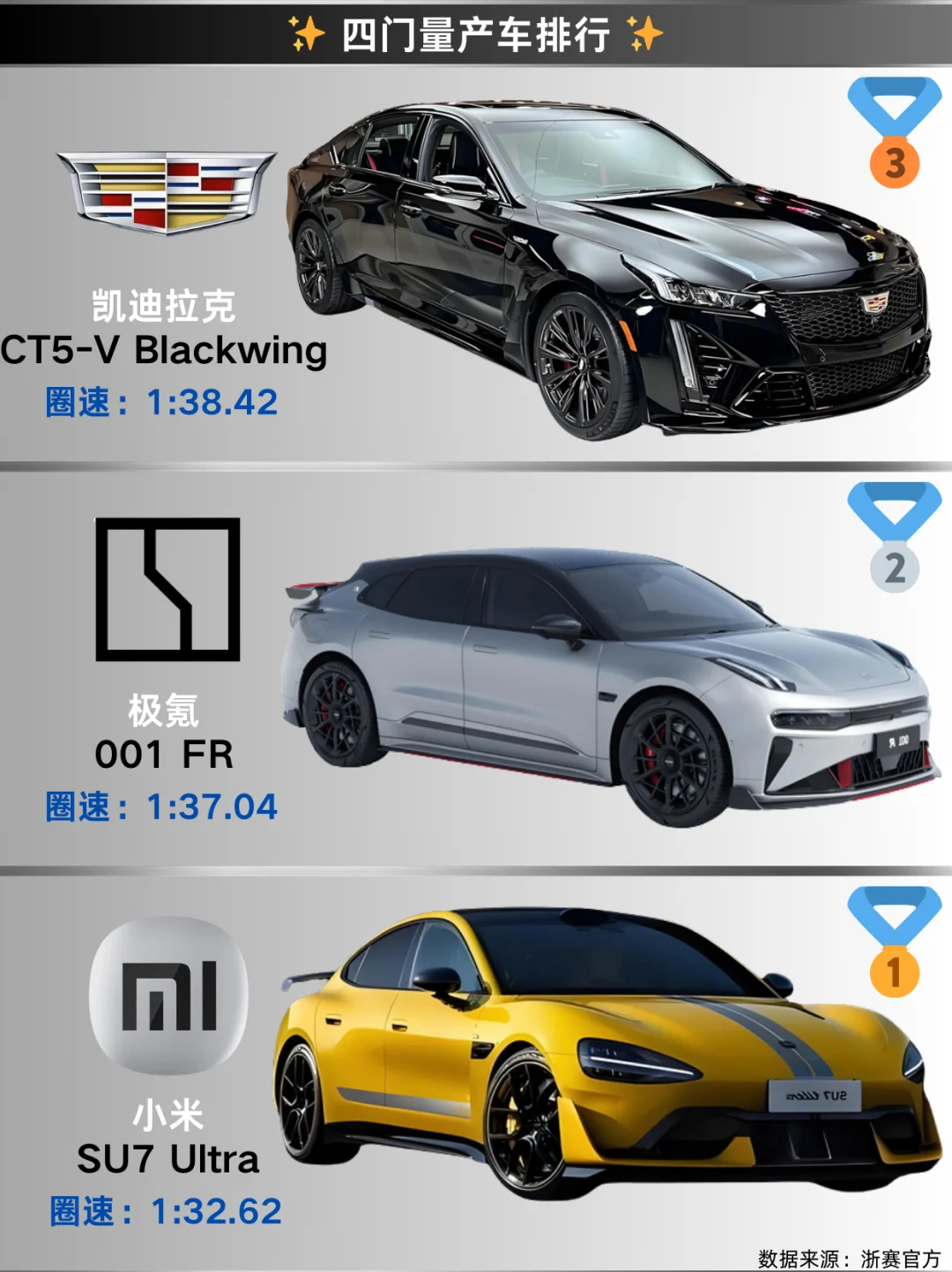 🥇小米 SU7 Ultra:圈速 1:32.62 ,小米汽车首秀即惊艳,SU7 Ultra 凭借出色的调校和性能,在四门量产车中拔得头筹,展现了科技企业进军汽车领域的强大实力。