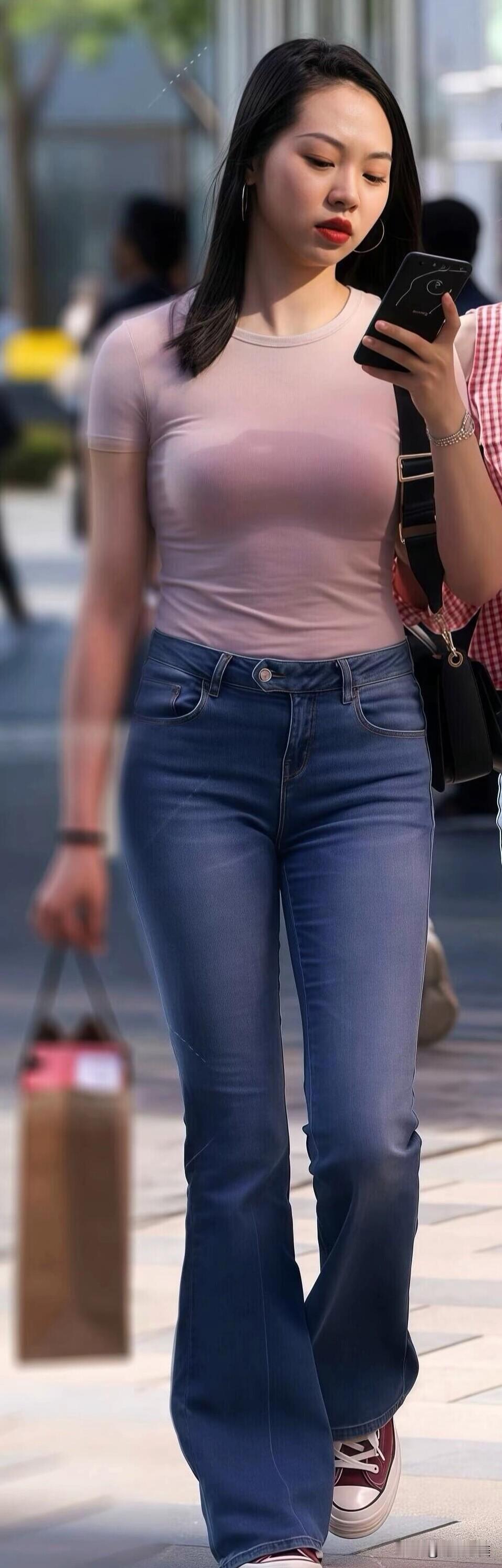 小姐姐简约穿搭超吸睛!浅粉上衣搭配蓝色喇叭牛仔裤,脚踩帆布鞋,气质干练又不失活力。