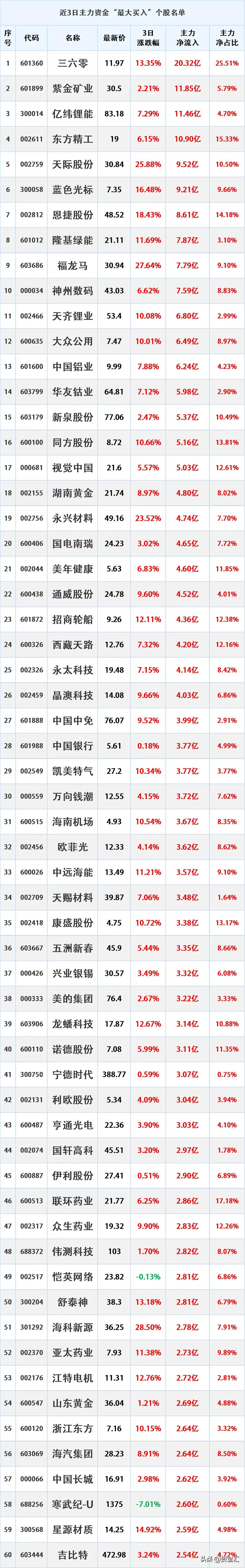 最近三日,主力资金大幅流入的股票名单。 资金流入是指在一定时期内(如一天、一周等),主动买入某只股票的资金量大于主动卖出该股票的资金量。主动买入是指投资者以卖方的报价直接成交,显示出投资者对该股票的积极购买意愿。
