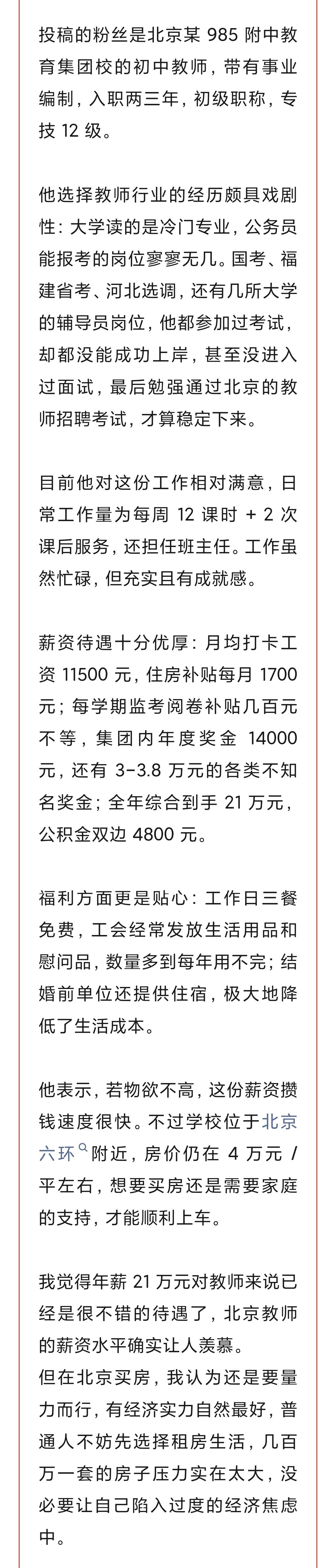 北京初高中教师收入有多少?入职不到三年,专技12级,五环外985附属中学,班主任,每周工作12课时+2次课后服务。全年收入多少呢?共21万左右,公积金双边4800。 要我说,这收入可以的了。才入职不到三年,有编制,还有上升空间。工作强度也不算大,还有寒暑假,五环外的房价如今跌倒三四万甚至更低,工作三五年后就算父母不帮衬小夫妻双方买个房还是不成问题的,何况现在绝大部分父母都有首付支持的。