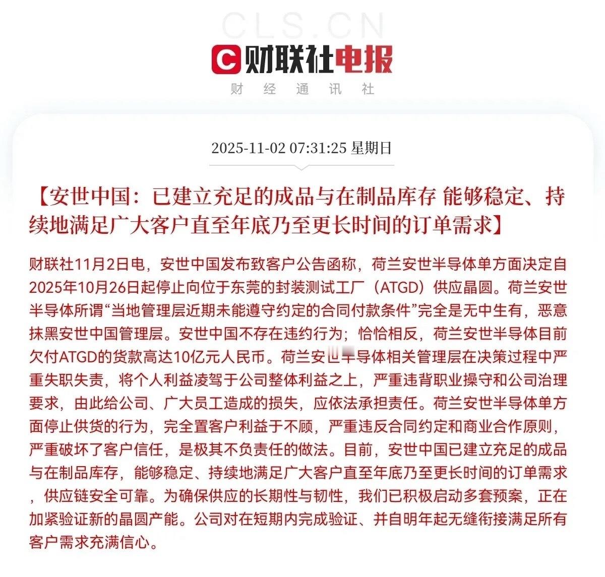 重大利好!重大利好消息来了!刚刚安世中国又发布了致客户公告函,不出意外的话,满仓