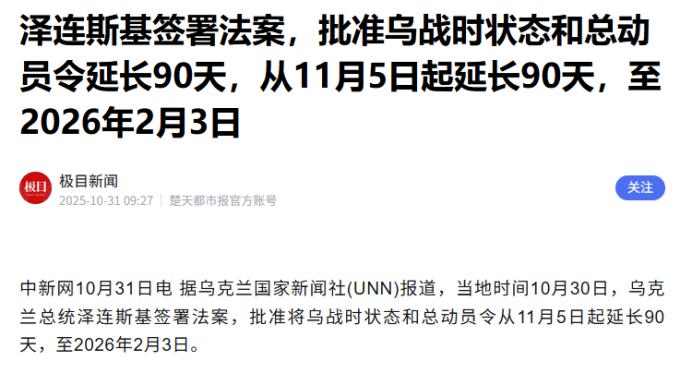 泽连斯基正式宣布   2025年10月31日,乌克兰总统泽连斯基签下新法令,批准将乌克兰战时状态和总动员令一口气延长90天,直到2026年2月3日。   战争的惯性早已让乌克兰难以停下脚步。延长90天的决定,既是对战场态势的回应,也暴露了其深陷泥潭的无奈。   这已经不是乌克兰第一次延长相关法令了。今年7月刚延过一次,眼看11月5日就要到期,泽连斯基没等议会多争论就签了字。从2022年2月冲突爆发算起,这种“续期”已经成了乌克兰政坛的常规操作,大家甚至都不用猜就知道结果会是这样。   前线的局面根本不允许乌克兰松劲。2025年10月的战场比之前更胶着。俄罗斯还掌控着乌克兰19%的领土,10月25号刚借着恶劣天气发起过机械化突击,虽然损失了不少车辆,但进攻的势头没停。   乌克兰这边也没闲着,10月23号出动了近200架无人机袭击俄罗斯,连莫斯科的机场都被迫临时关闭。双方就这么你来我往,谁都占不到绝对便宜,但谁也不敢先撤。   兵员消耗的速度快得吓人。顿巴斯前线的伤亡数字一直没降下来,不少经过北约训练的精锐部队得留着准备关键反攻,基辅只能把刚动员的新兵往战场上送。   这些新兵里,很多人之前从没摸过枪,只在基地待了两三天,领了苏联时期的旧步枪就得上前线。有士兵抱怨害怕,军官只丢下一句“战场会教你”,这话听着都让人揪心。不延长总动员令,前线的兵源根本补不上。   更头疼的是西方援助掉了链子。2025年1到9月,西方承诺给乌克兰680亿美元军事援助,实际能用上的才320亿,连一半都不到。已交付的武器里,有23%因为缺零件、没人维护,直接堆在西部仓库里当摆设。乌克兰最急需的远程防空导弹,交付量只达到需求的29%,无人机也才45%。反倒是老旧的步兵战车这类用不上的装备,占了交付清单的60%以上。   运输环节更是乱成一锅粥。俄罗斯经常炸乌克兰西部的交通枢纽,援助物资从波兰、罗马尼亚运过来时总延误。乌克兰安全局9月还披露,半年内至少有2.3亿美元的武器“失踪”,后来发现一部分流到了中东黑市。武器送不来、用不上、还会丢,乌克兰只能靠自己人填战线。   国内的日子也不好过。乌克兰的经济比战前缩水了三分之一还多,通胀率高达9%,老百姓的生活压力越来越大。超市里的日用品价格涨得厉害,很多家庭得精打细算才能过日子。但就算这样,也没法停下战争的机器。   国际上虽然有和平信号,美国副总统万斯都说斡旋有“重大进展”,塞尔维亚还主动要调解,但双方的诉求差得太远。俄罗斯想守住乌东的地盘,泽连斯基要收回包括克里米亚在内的所有领土,随便妥协哪一方,国内都交代不过去。   冬天很快就要来了,战场大概率会因为天气停摆,这本该是谈判的好机会。但泽连斯基还是签了延长令,他心里肯定清楚,一旦松了动员这根弦,前线可能立马就崩了。这场仗打到现在,乌克兰早就不是想停就能停的了,延长90天更像个被迫的选择,先撑过眼前再说。至于90天后怎么办,恐怕没人能给出答案。   来源:极目新闻【泽连斯基签署法案,批准乌战时状态和总动员令延长90天,从11月5日起延长90天,至2026年2月3日】