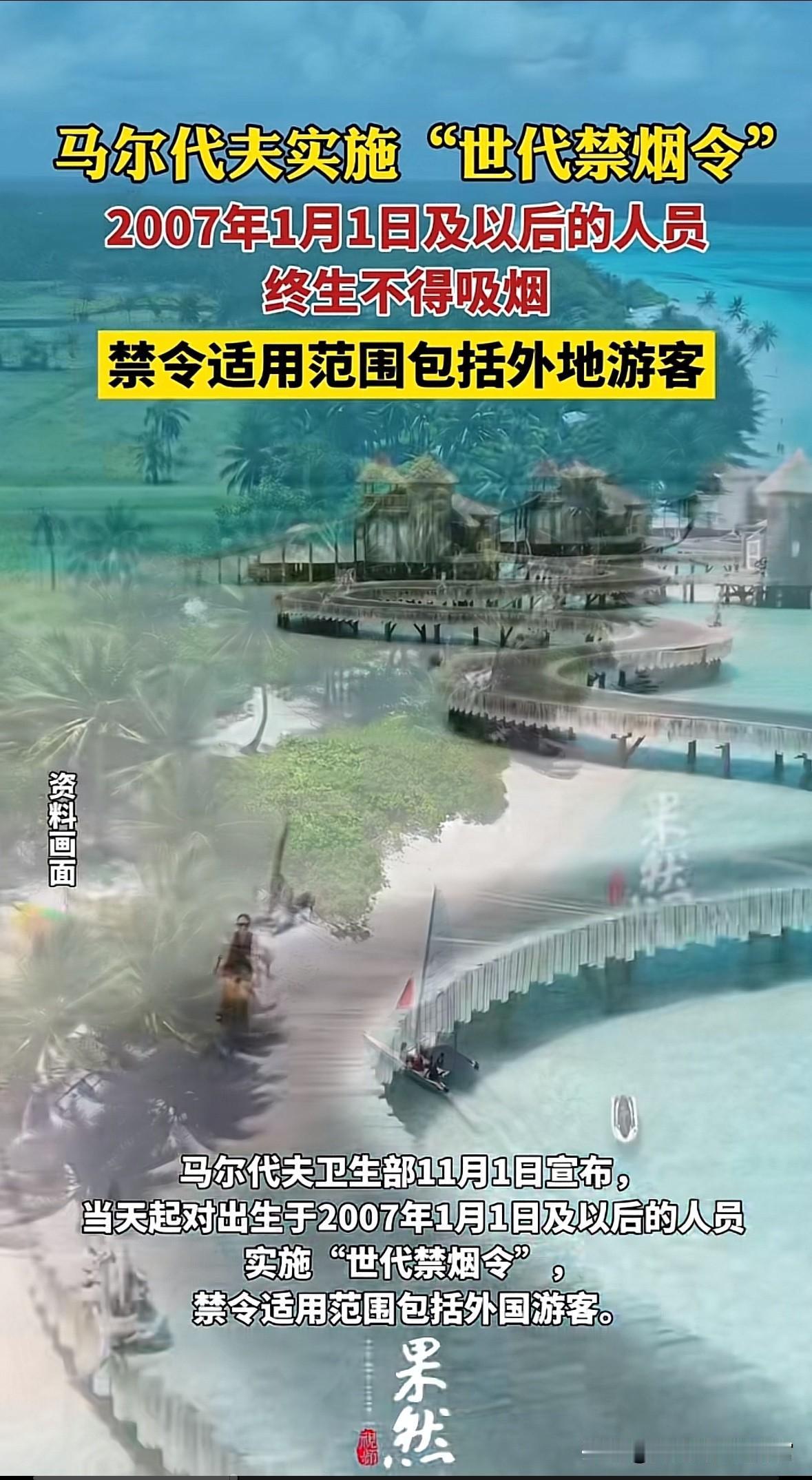旅游的注意了,马尔代夫颁布“全民戒烟” 11月1日,马尔代夫宣传,对07年后出生的本国及外国公民/游客,进行全面戒烟,其中包括电子烟等产品。 以前都是卡年龄,现在直接卡年龄段。马尔代夫的这一规定,相当于“世代戒严令”了,就俩字,给力,牛排!