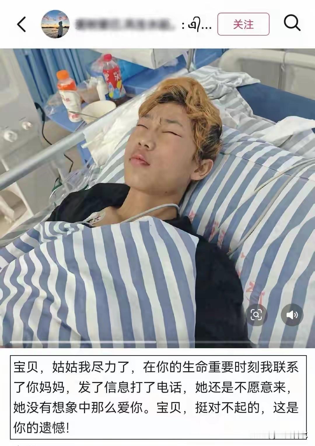 17岁少年因感情问题吃药抢救无效离世 离世前想见已有新家的母亲最后一面 姑姑多次电话恳求,孩子母亲狠心拒见 (孩子是因女友情感问题以及家庭母亲问题想不开,而吃的“毒”药) 姑姑通过老家亲戚联系上了孩子母亲的妹妹, 软磨硬泡下要到了孩子母亲电话,接通电话后,那边传来有孩子的哭闹声。(原来孩子母亲不仅重新组建了家庭还孕育了后代) 电话才说到一半,孩子母亲就打断了姑姑的话说道:“别跟我说这些,我跟他没关系了。” 一段交流后,电话那头最后抛出两个字“不来” 空气安静了,姑姑攥着手机发呆了许久,孩子的女友发来消息了,满屏的“对不起”,姑姑回复“不怪你”。 医生找到了姑姑跟孩子父亲,告知已经没有抢救的意义了,建议放弃,姑姑颤抖着在同意书上签了字,拔管半小时后,监护仪慢慢变成直线,孩子带着遗憾走了。只留下那张平时睡觉垫在枕头下的泛黄照片,边角已经起卷,照片里是孩子母亲抱着他儿时的样子。