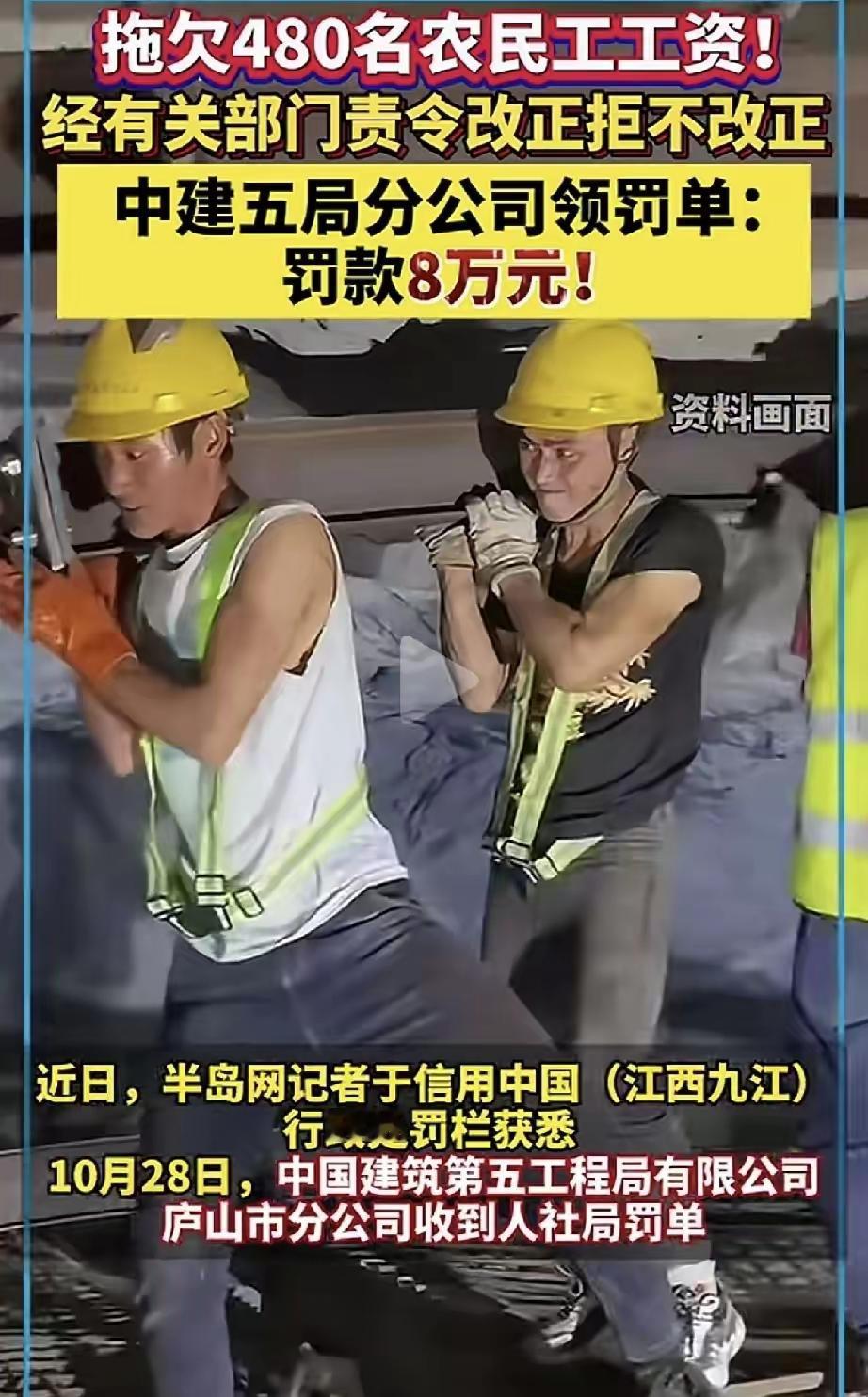 这处罚就是毛毛雨了啦 中键五局拖欠488名农民工的工资,多次责令改正,还是拖欠,最后被有关部门罚了8万,这简直是太厉害了,居然被罚了8万! 488个人,就算平均一个人1万,已经480万了,你这8万太狠了,简直就是毛毛雨,最后造孽的还是农民工! 有网友说:我有个做粮油生意的朋友,被谋局赊欠了 20 w 的货款,快十年了,没要回来,哈哈,所以有些蛋糕能吃,有些,真不能随便吃 报道只写了中建五局拖欠农民工工资,没有写中建五局为啥拖欠农民工工资!中建五局有钱不给劳务公司和分包单位支付工程款吗?深层次的东西不能详细的说出来! 正常,因为中间肯定还有个分包商的问题,中建五局怎么可能是跟这400多个农民工签的合同 不用担心,总部会处罚他们领导的。国资委会考核他们总部的。看着金额小,已经是落实党和国家重大方针政策不力,会背处分的。 大家怎么看呢?