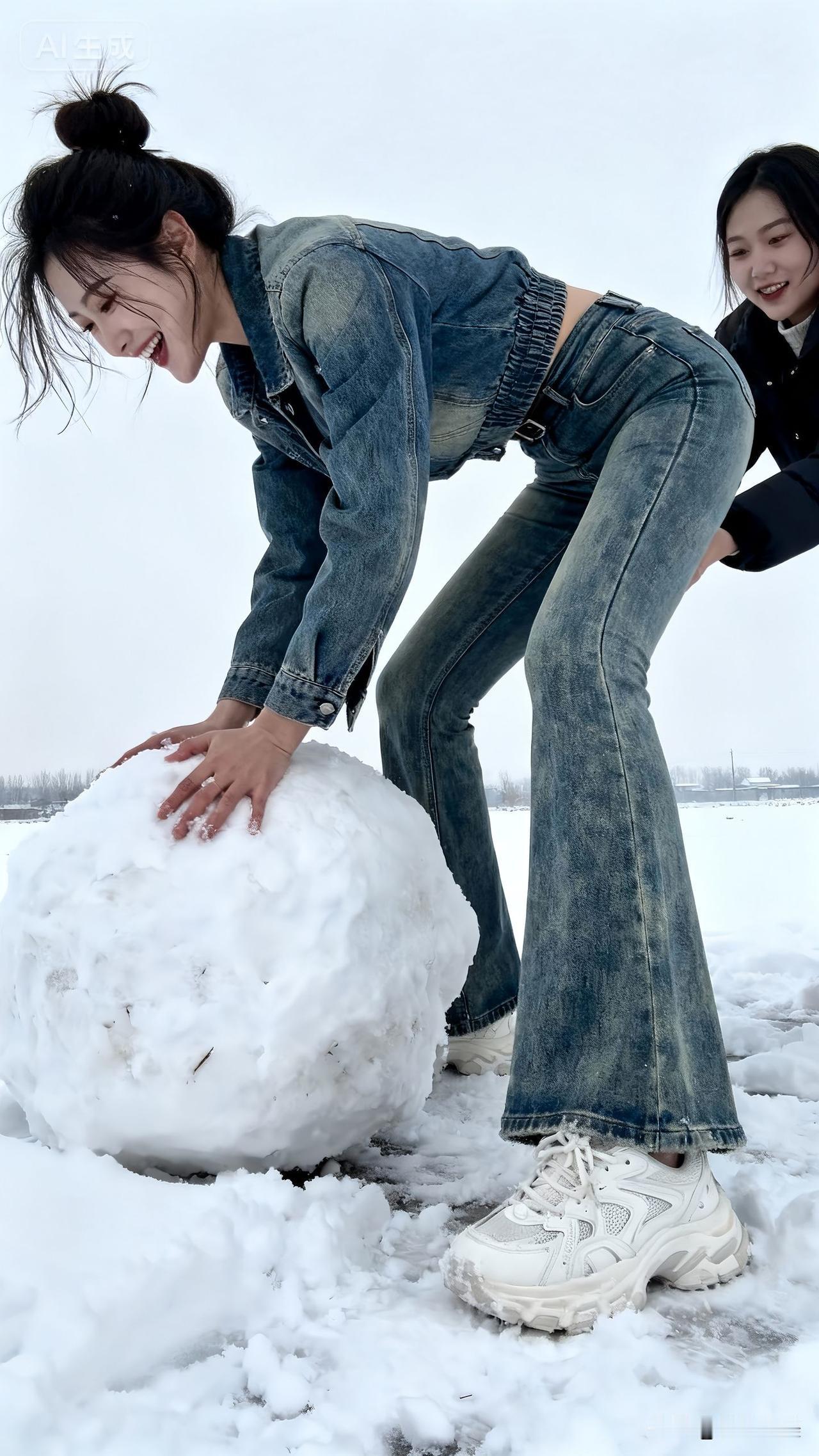 雪地里,她穿着牛仔套装,扎着丸子头,和朋友一起滚雪球,笑容灿烂,快乐就是这么简单!