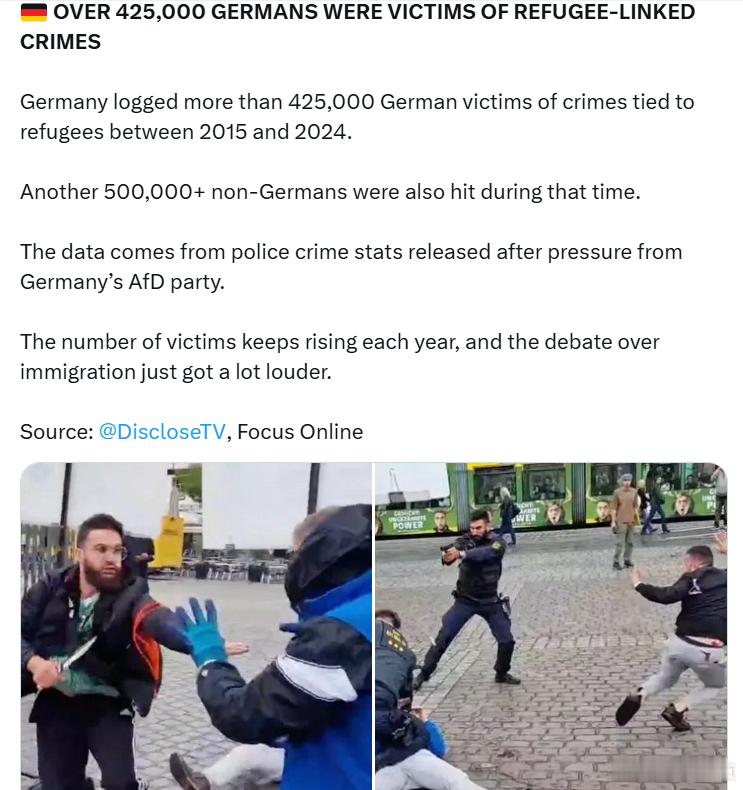 从2015年到2024年,德国记录到超过42.5万名德国公民 因与难民有关的犯罪而受害。